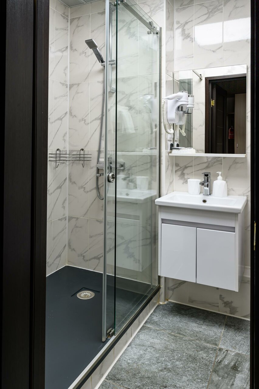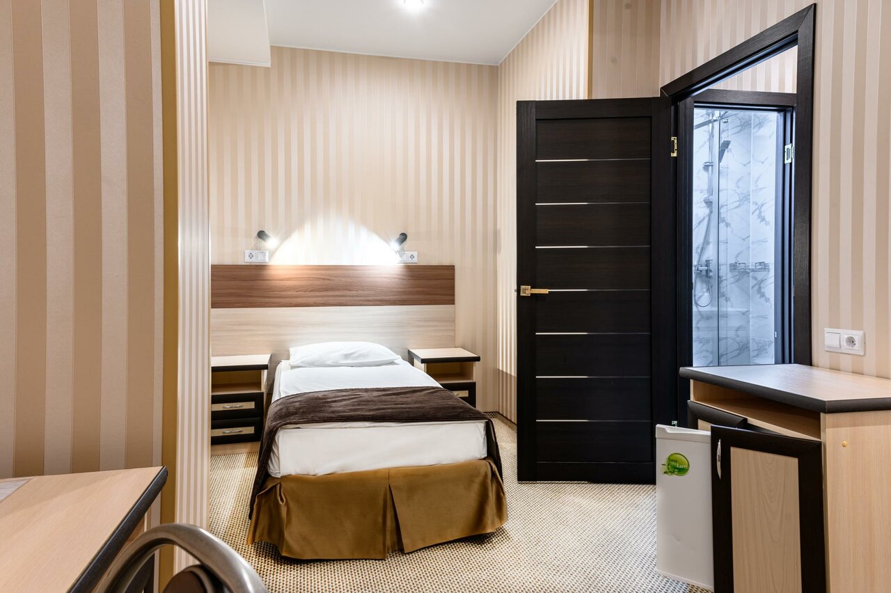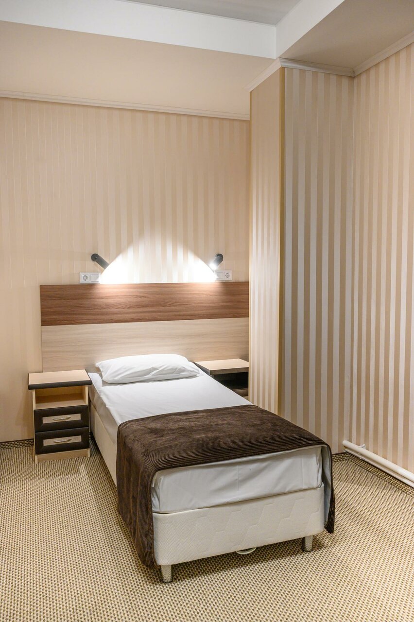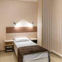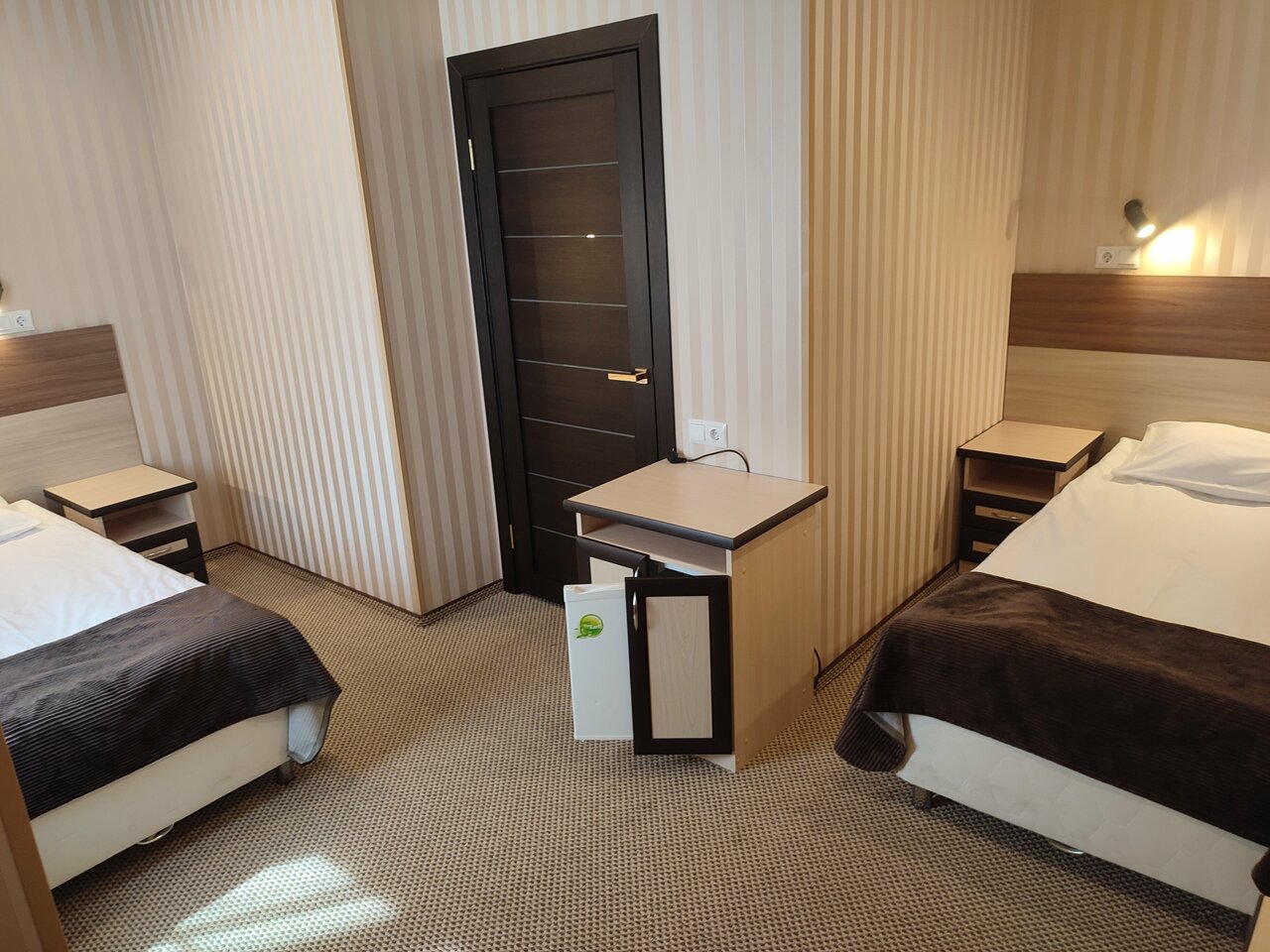 Номер (2-х местный) – это светлый номер, оборудован двумя односпальными кроватями с ортопедическими матрасами, кондиционером, плотными шторами. Удобства находятся в номере (санузлы и индивидуальные душевые комнаты).