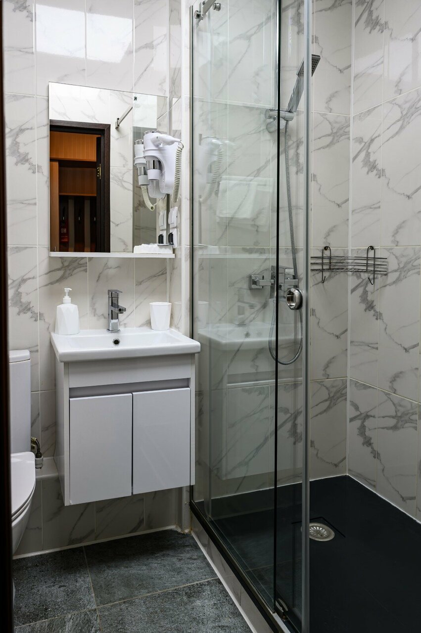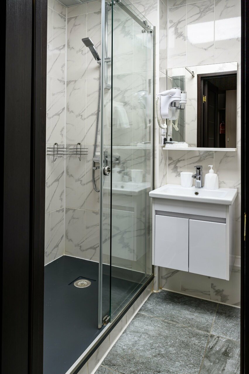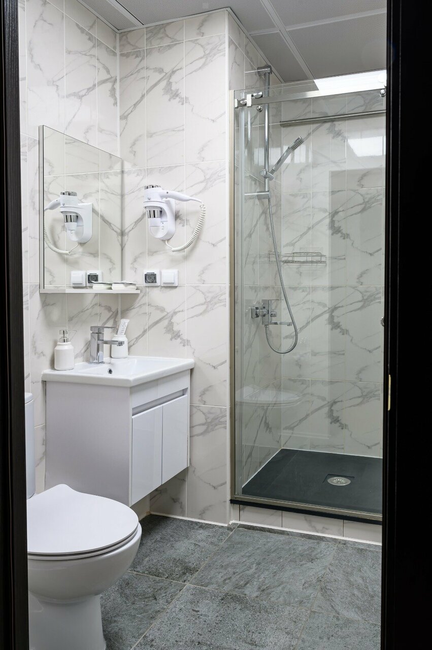 Номер (2-х местный) – оборудован двумя односпальными или одной двухспальной кроватями, в номере фен, холодильник, телевизор, Wi-fi. Удобства находятся в номере (санузлы и индивидуальные душевые комнаты).