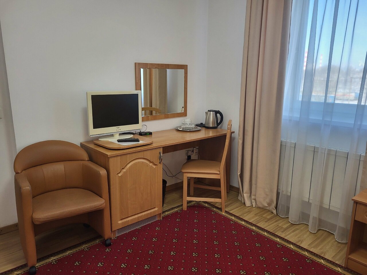Очень удобный номер стандарт — просторный, тёплый. Очень чисто! Есть столовая на 4 этаже, можно позавтракать и пообедать и даже поужинать. Готовят неплохо. Единственный минус — далеко от центральной части города.