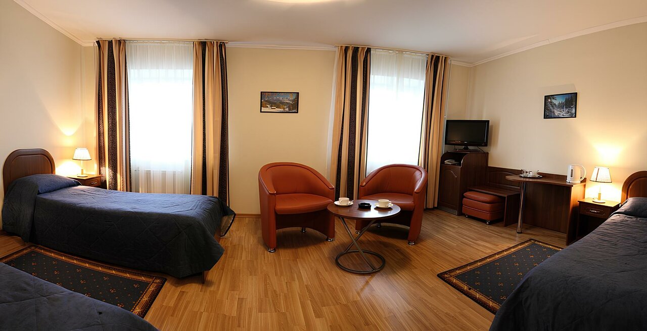 Комфортабельный номер с тремя спальнями, холлом и гостиной. Площадь номера 60 кв. метров. Отдельные туалет и душевая. Рассчитан на проживание от4 до 6 человек. Стоимость при заселении 4 человек. За каждого следующего гостя стоимость 1000 р/сутки.