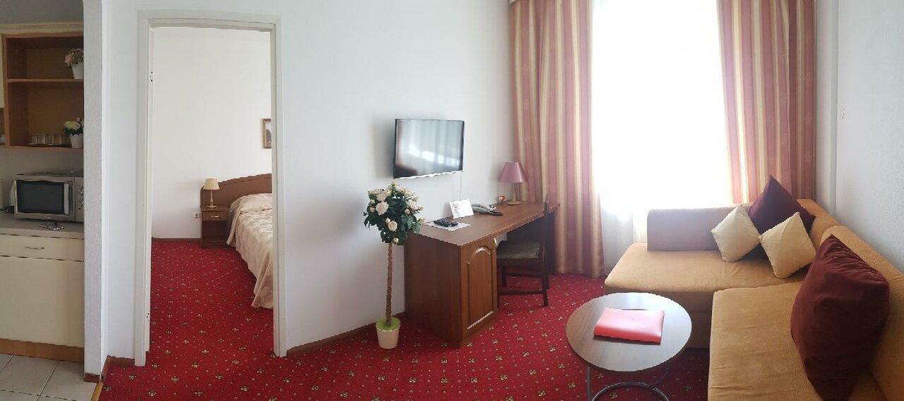 Номер расположен на 2 этаже, площадь 28 кв. метров. В номере отдельная спальня и гостиная с выходом на балкон. Стоимость при заселении 2-х человек. За каждого дополнительного гостя доплата 1000 р/сутки.