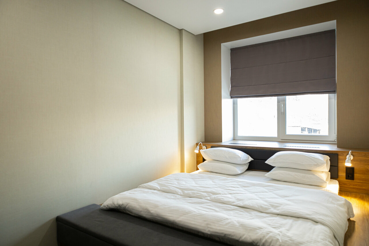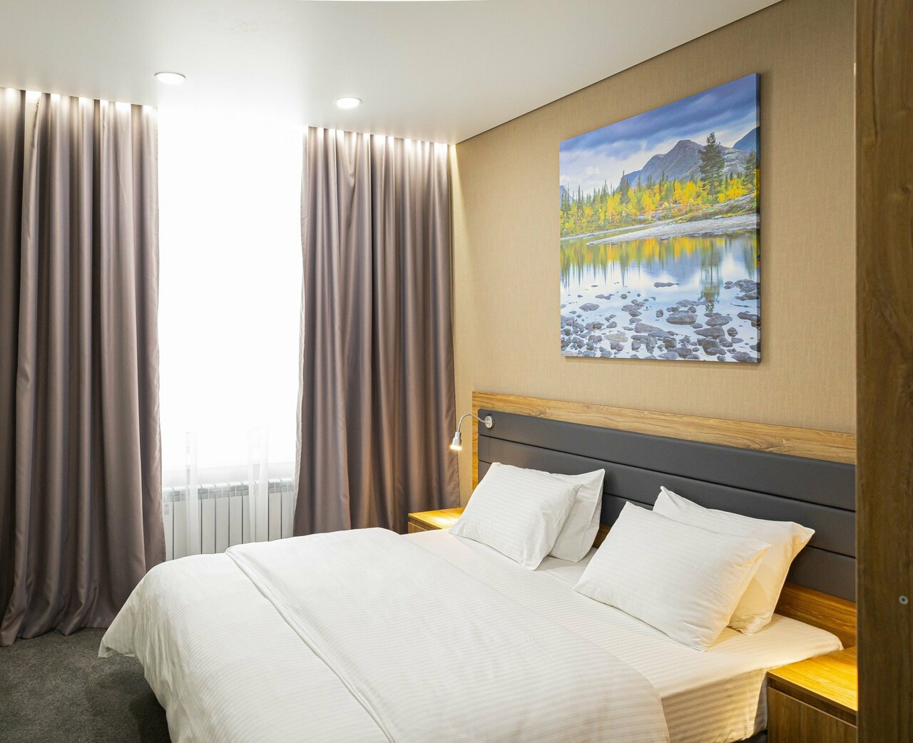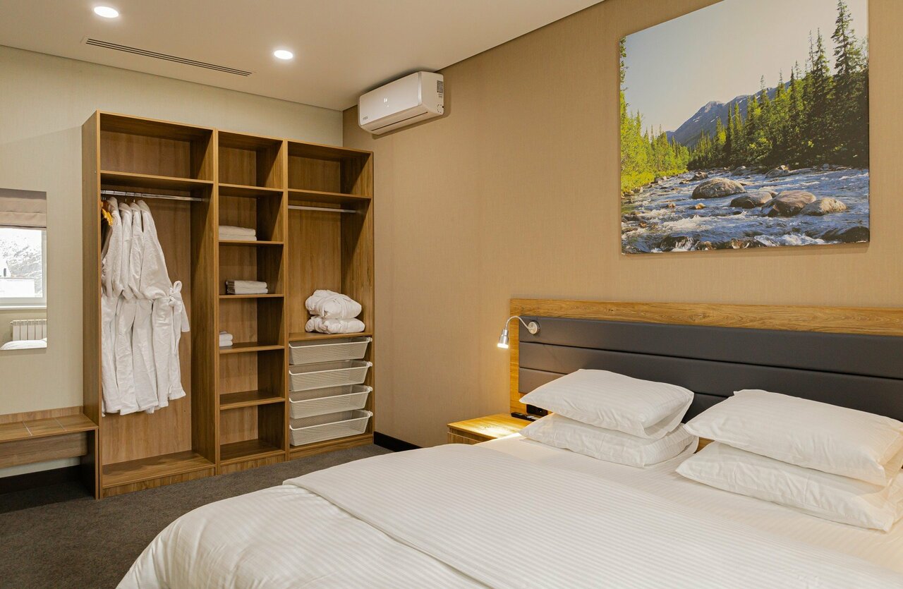 Светлый двухместный номер. Номер оснащен: двуспальная кровать (140*200), прикроватные тумбочки, туалетный столик, шкаф-купе, сейф, ТВ, кондиционер, мини-холодильник. Ванная комната: душ, туалет, раковина, зеркало, фен.