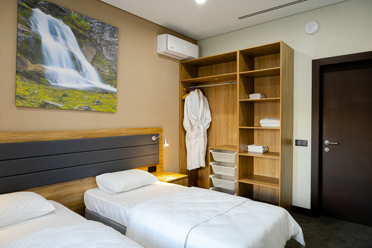 Номер оснащен: двуспальная кровать (140*200), односпальная кровать, прикроватные тумбочки, туалетный столик, шкаф-купе, сейф, ТВ, кондиционер, мини-холодильник.