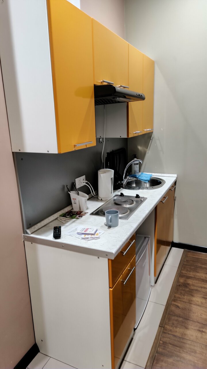 Отель хороший, твёрдая 4ка. Из приятного — есть кухня, где можно готовить. Холодильник, микроволновка, все в наличии. В номерах уютно, чисто. В общем, внутри гораздо лучше, чем снаружи. С заселением были небольшие проблемы, но все решили оперативно. Проверяйте, что в чеке, который вы отправляете в отель статус ‘оплачено’.