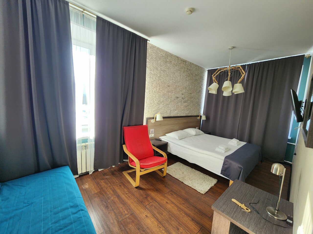 В номере санузел, сплит-система, телевизор.В номере односпальная кровать, двуспальная кровать, диван. Также в номере шкаф для одежды, тумбочки. Сан. узел с душевой кабиной. Возможно размещение дополнительного места. Номер без балконаСтоимость завис