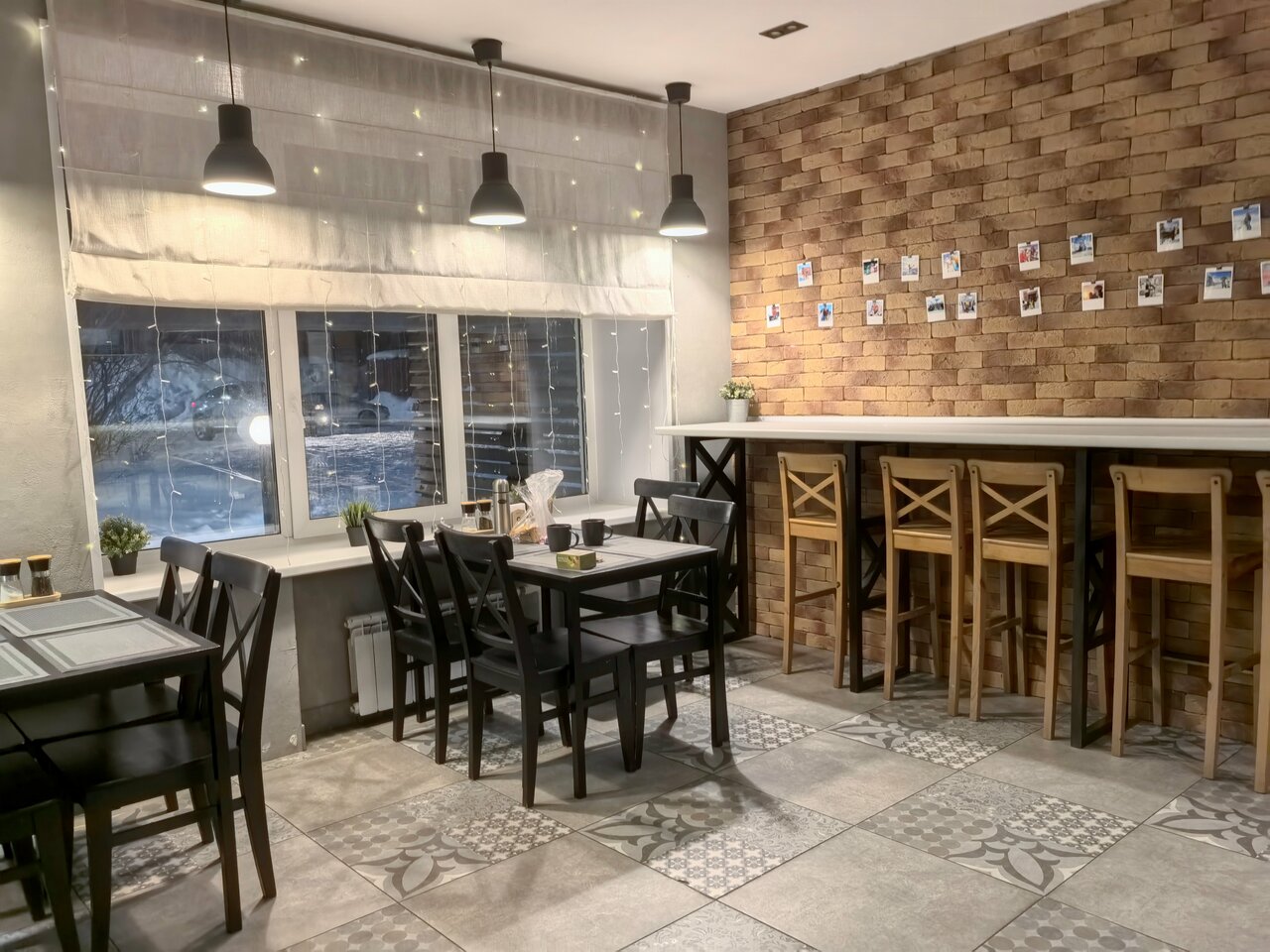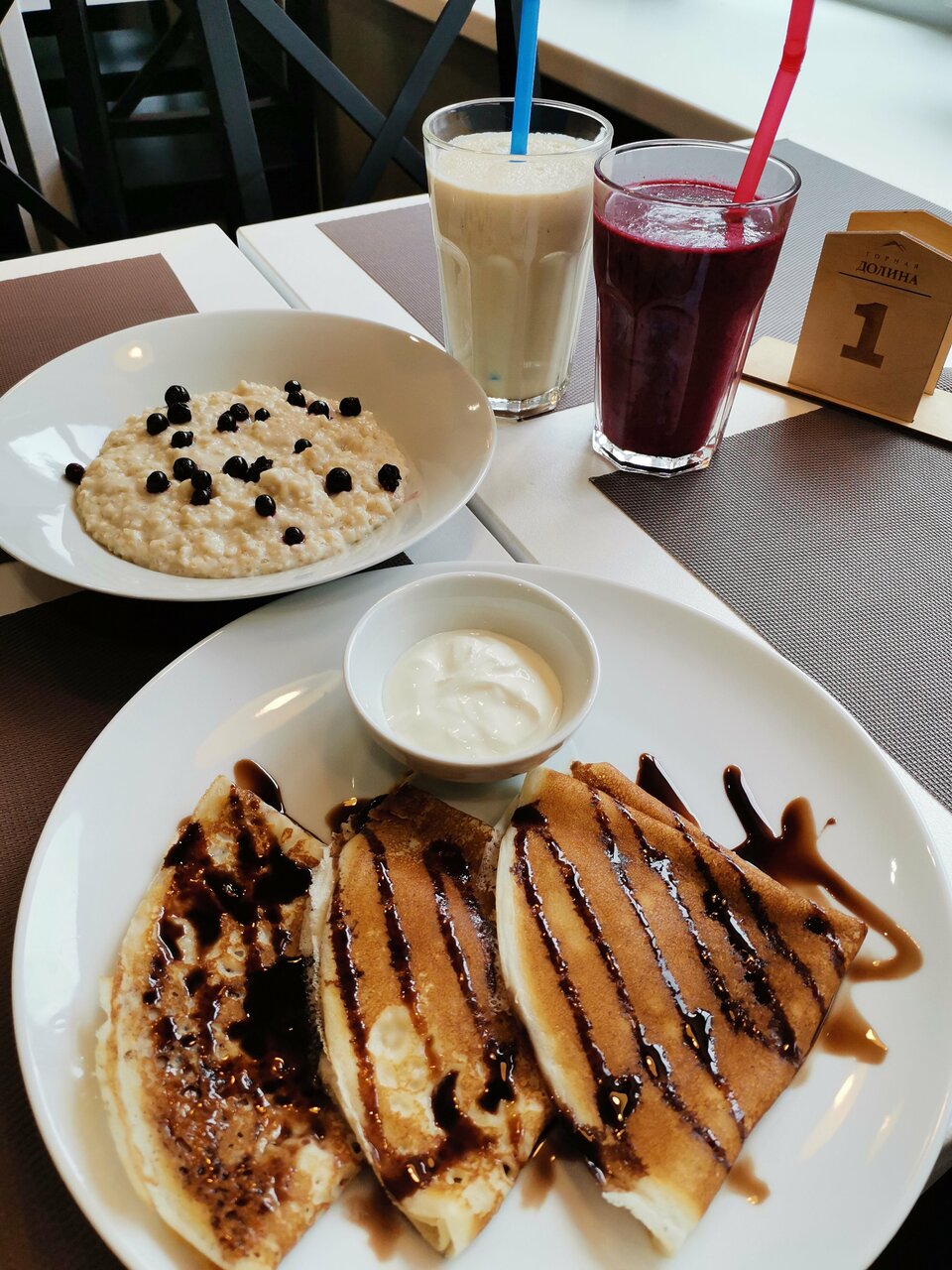 Отличное место для отдыха между прогулками в горах. Всё чисто и аккуратно, приятный интерьер и очень доброжелательные сотрудники. В гостинице есть в кафе в котором проходили завтраки и можно было пообедать и поужинать. Меню не большое, но разнообразное, много всего интересно, хоть и были блюда на любителя. Завтраки очень сытные, есть как готовые блюда — нарезка, каша, так и блюда которые готовят для вас по предварительному заказу — омлет, блины, сырники или яичница, очень интересные смузи. В общем было вкусно и уютно. Отдельно стоит сказать про вид из нашего номера, это была студия на втором этаже, окна которой расположены с торца здания. Утренний (да и не только утренний) вид из окон был великолепен. Останавливались в студии втроем, там есть двуспальная кровать и раскладной диван.