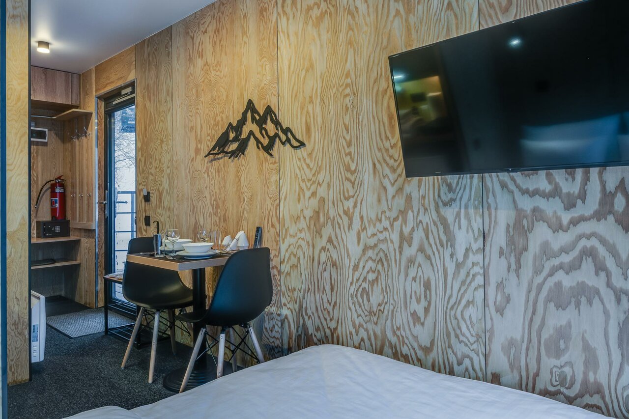 Жила с 10 по 13 декабря. Абсолютно новый отель, в номере есть все необходимое, включая плиту и посуду. Номер компактный, но комфортный. Отдельное спасибо за панорамное окно с видом на горы