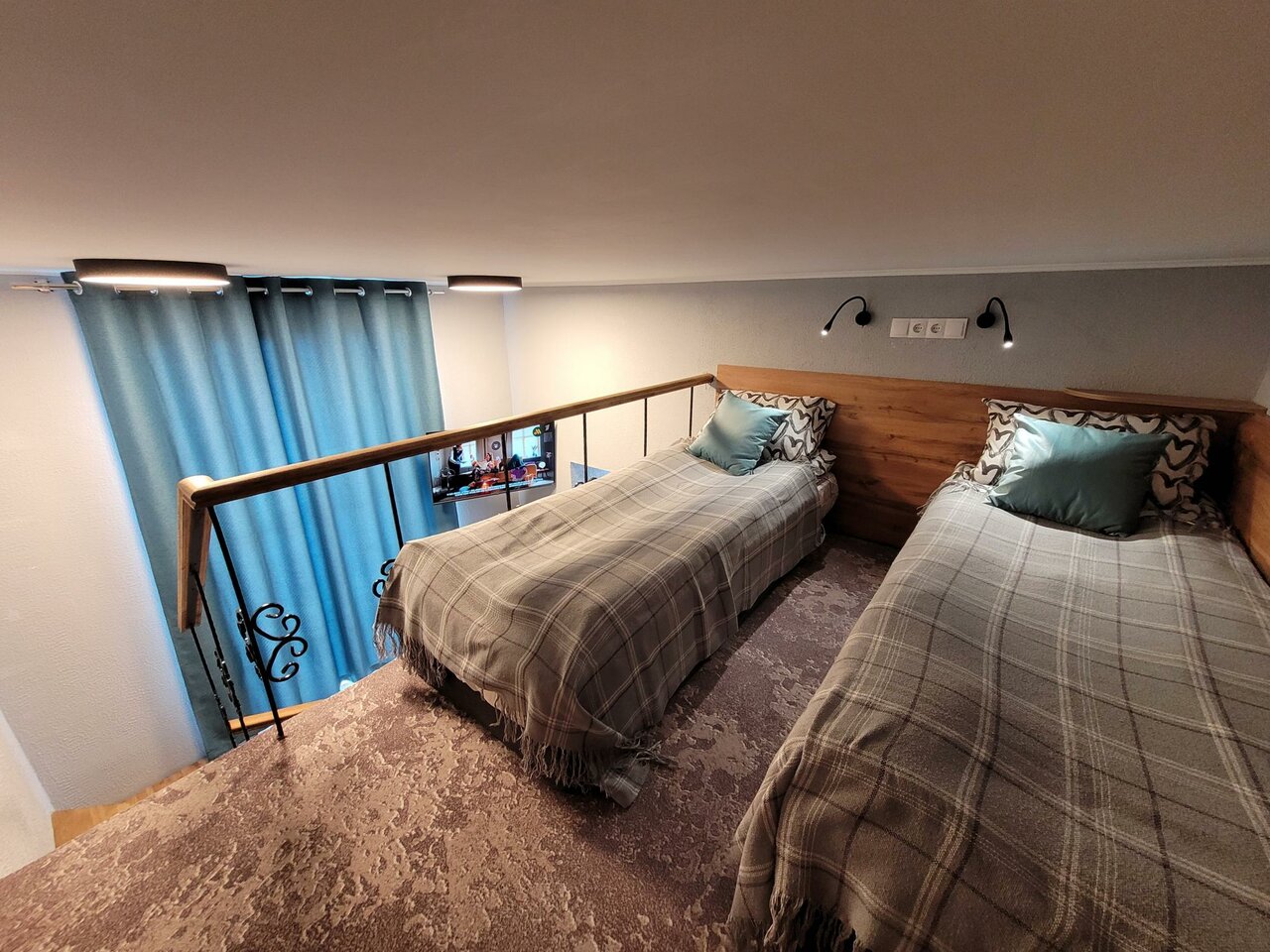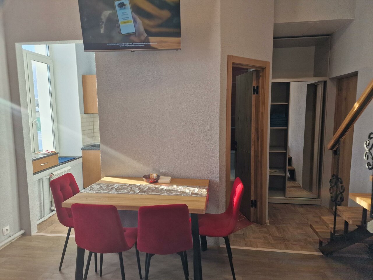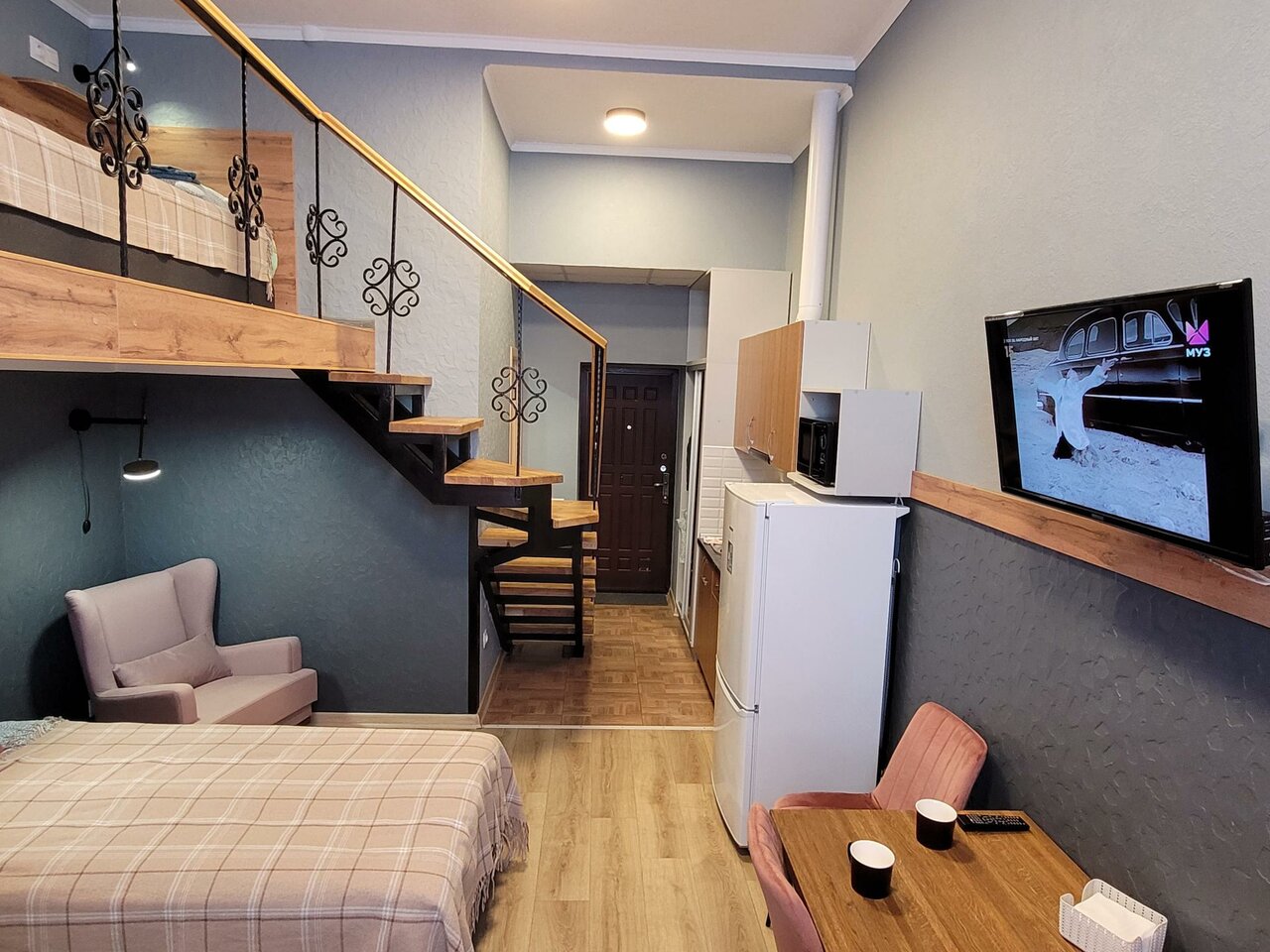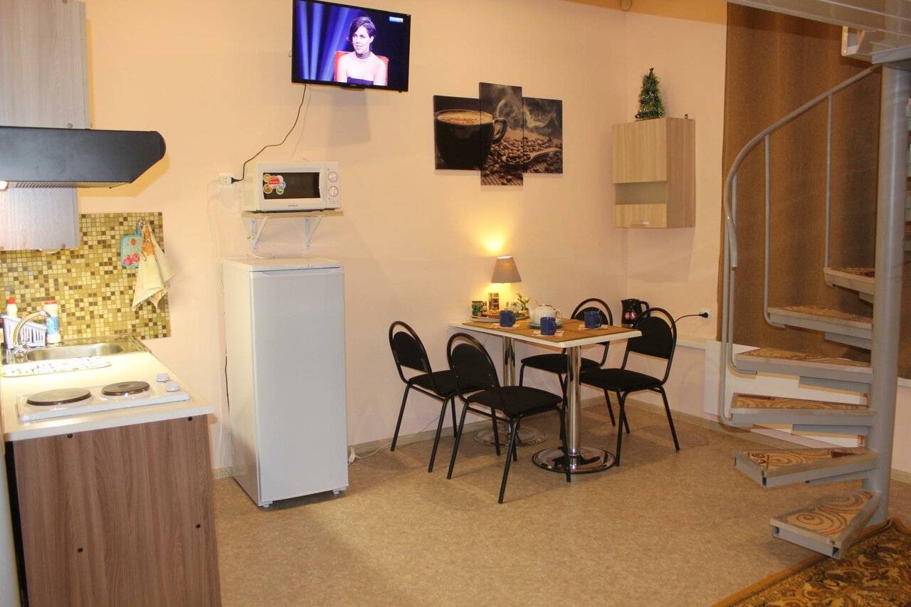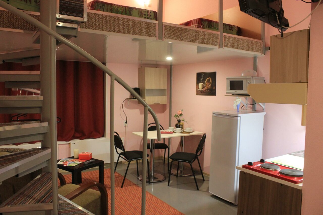 - Наличие Wi-Fi, телевизора, кухонной утвари.; Шикарные двухуровневые номера с винтовой лестницей.; Чистое постельное белье, плотные шторы.; Близость к центру города.; Тихое месторасположение.