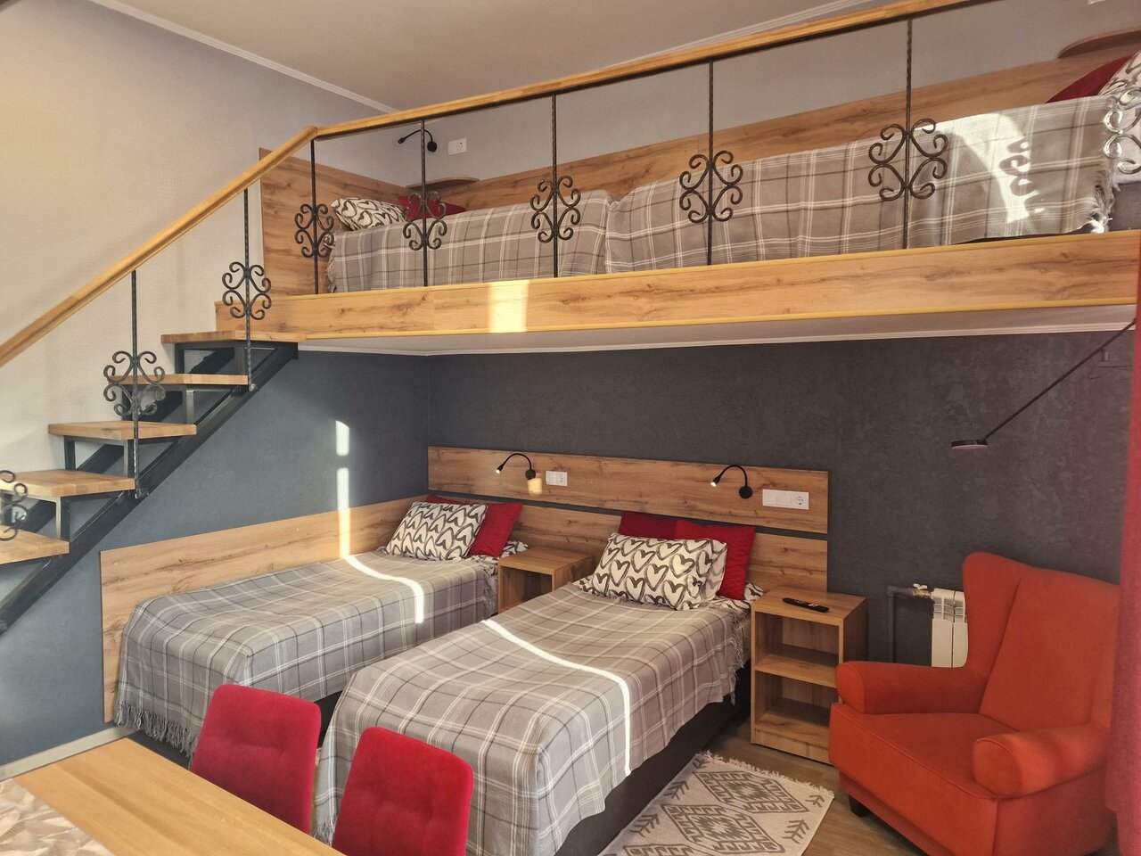 Проживали в отеле с 10 по 14 марта. Всё понравилось. Номер шикарный, двухуровневый, с винтовой лестницей. Собственная кухня, телевизор, санузел. На этаже есть стиральная машина, есть стиральный порошок. Рядом сушильная камера. Есть место для парковки. Мелкие недостатки являются продолжением достоинств.