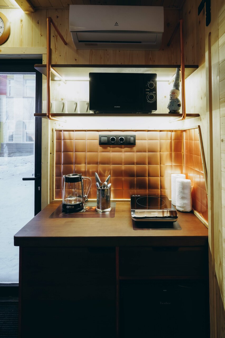 Домик (бочка) неплохой, но добавить локальный wifi было бы неплохо (в основном корпусе сеть есть), а если еще и небольшой тв повесить, то будет совсем хорошо.