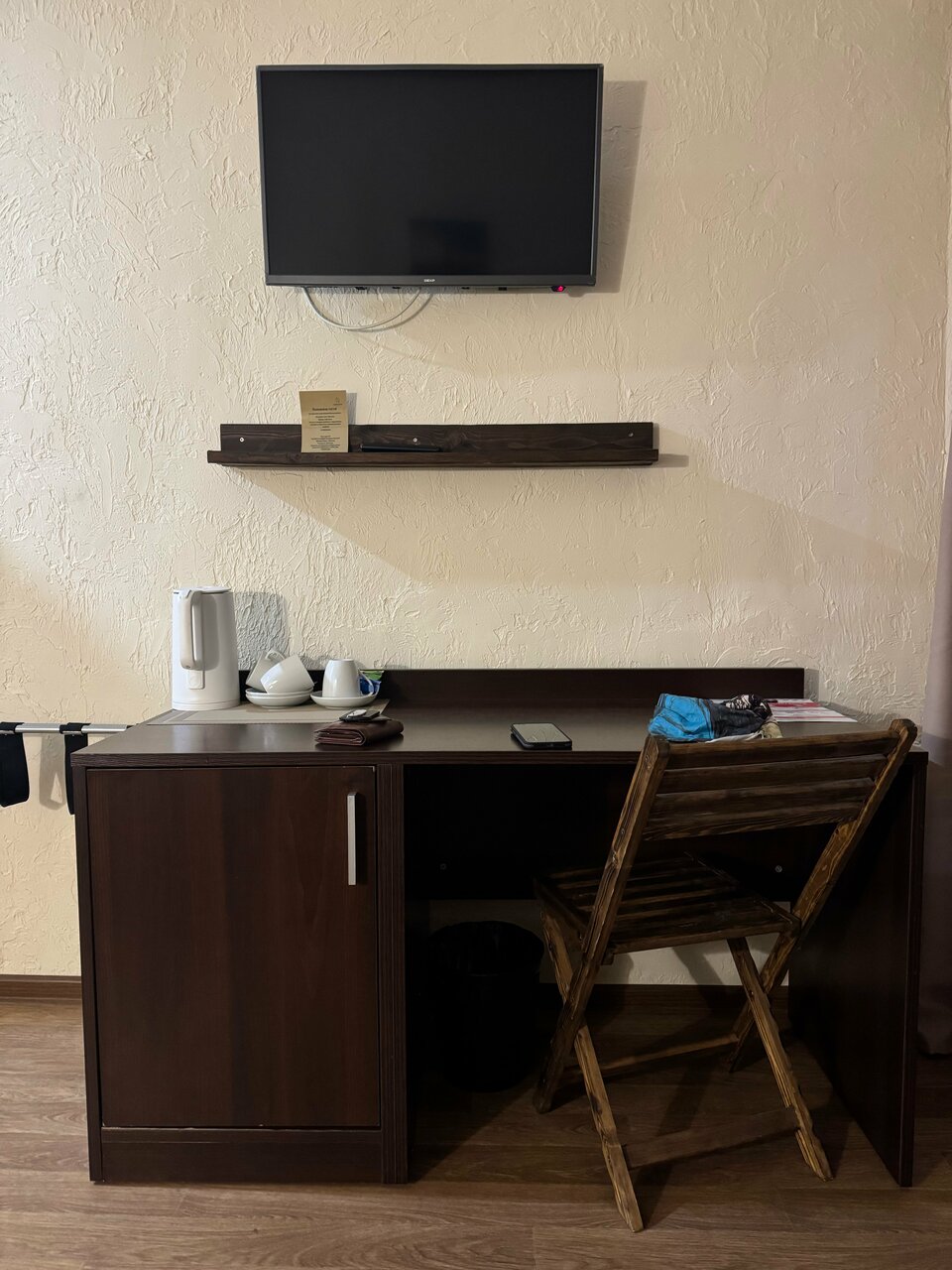 Старое здание, но делают ремонт. Рядом с горами. Брали двухкомнатный люкс. Всё чисто, есть всё необходимое: холодильник, чайник, фен. Минус- не работал телевизор, позвонили администратору, но вопрос так и не решили.
