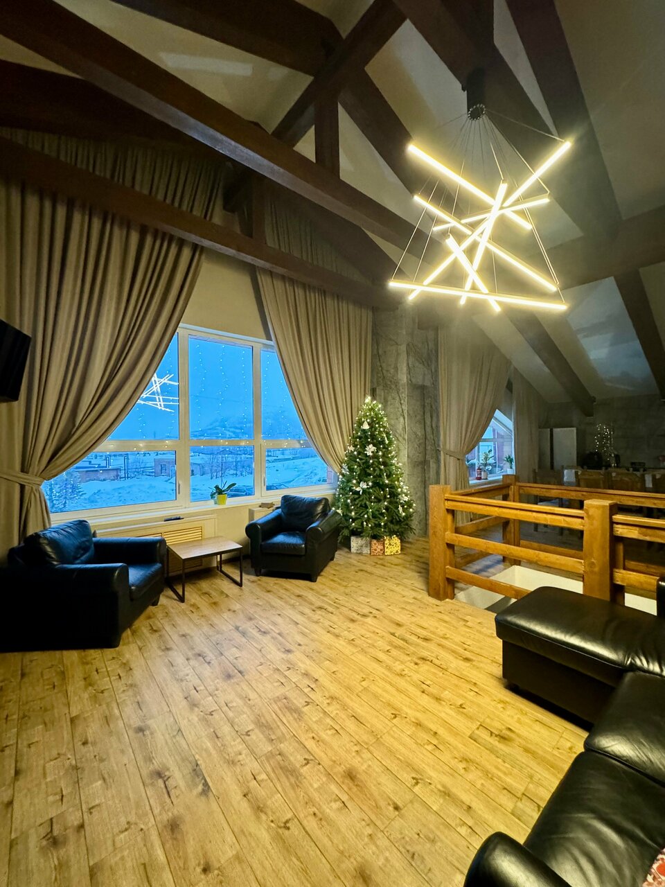 Отдыхали компанией из 9 человек. Расположение отличное. Рядом магазин светофор(соседнее помещение). Тут же и караоке/баня/хаммам. Имеется все для отдыха после горнолыжного. НО ЕСТЬ ОДНО НО в доме располагается баня и хаммам для всех желающих кто захочет отдохнуть. 24/7. Следовательно если вы устали и легли спать, то никто не отменял у людей отдыхающих там, выйти на улицу, покурить, поговорить(могут и на повышенных тонах), врубить музыку в 4 утра и тд. Естественно проживающие в доме это все слышат и доставляет дискомфорт. Поставил бы из-за этого даже 3.5/5. Но повторюсь что расположение и сам дом для проживания рекомендую. Ах да, забыл уточнить. 2 туалета, 1 душ- на 9 человек)))