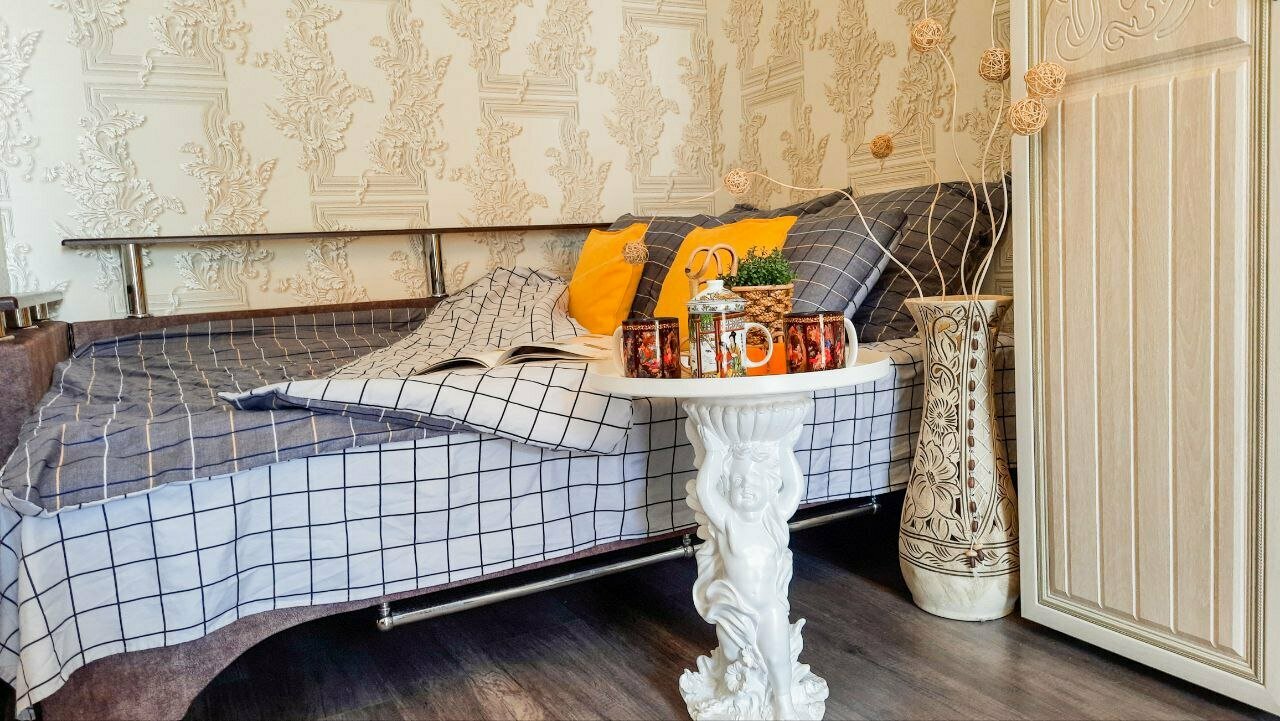 Винтажно, красиво, все сделано со вкусом. Были приятно удивлены чистоте. Как будто зашли не в съёмную квартиру, а домой.