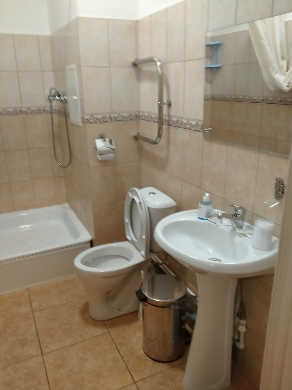 есть душ, но горячая вода начинается после тёплой, а тёплая через 12 минут после открытия крана а так всё хорошо