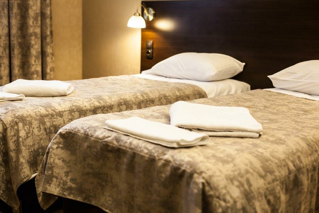 В номере- санузел- односпальная и двуспальная кровать - кондиционер- кресло- прикроватная тумба- шкаф- телевизор- Wi-Fi - зеркало;- чай/кофе/сахар/питьевая вода- тапочки- гель,шамп.,зубн.набор- губка для обуви- фен