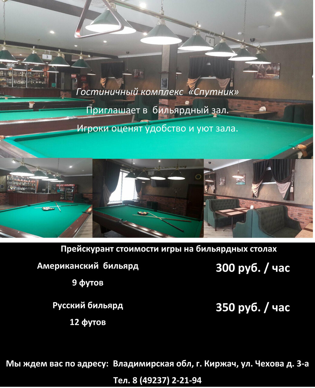 Отличное место! Мои горячие рекомендации. Вежливые сотрудники, чисто, комфортно. В кафе готовят очень вкусно. Мы любим с друзьями посидеть допоздна за настолками и разговорами, сидели в бильярдной до часу, нам никто слова не сказал, хотя она в принципе уже не работала. Спасибо! Ещё приедем в Киржач и остановимся непременно у вас.