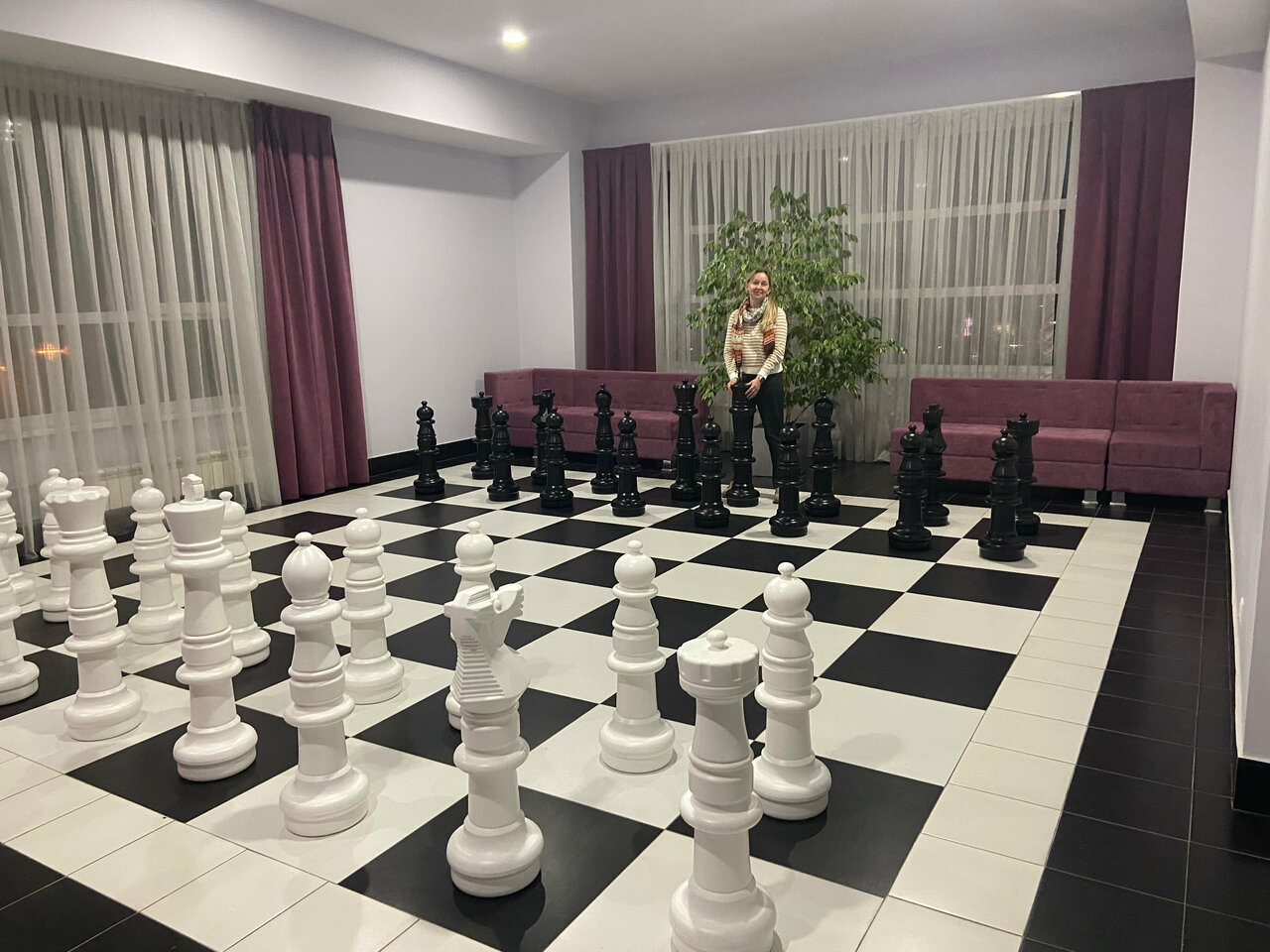 - Большие холлы, кресла, библиотека, напольные шахматы.