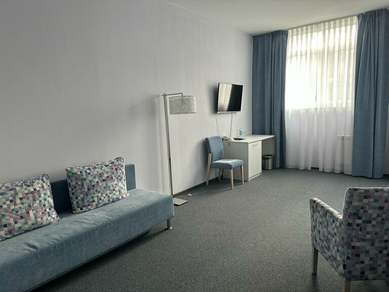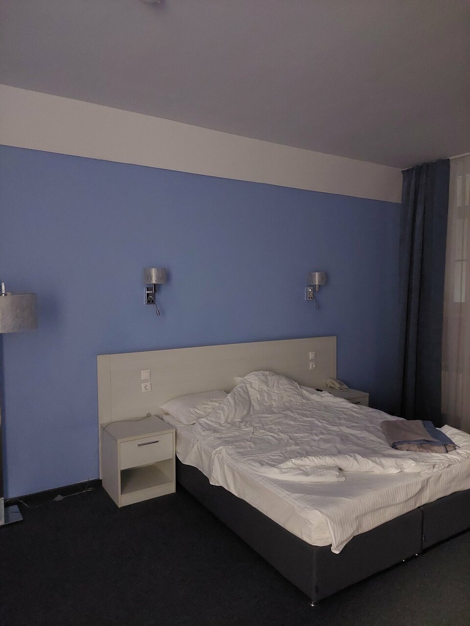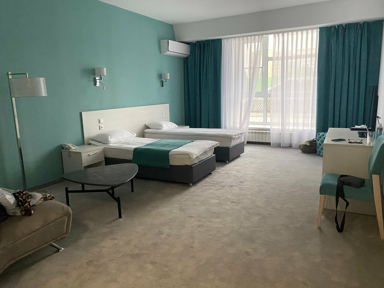 Мне гостиница понравилась. Пришлось остановиться по сложившимся обстоятельствам на пол дня. Монументальное здание с просторными номерами. Высокие потолки, у меня возникли ассоциации с постройками советского союза. Кафе было закрыто но всё равно покормили, еда неплохая. В номере было чисто. На ресепшн администратор вежливый, всю нужную информацию удалось получить.