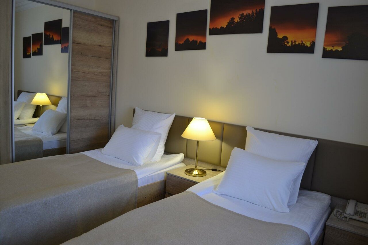 Стандартный номер отеля «Когалым» с двумя комфортными односпальными кроватями – идеальное сочетание уюта и сдержанного стиля по выгодной цене.