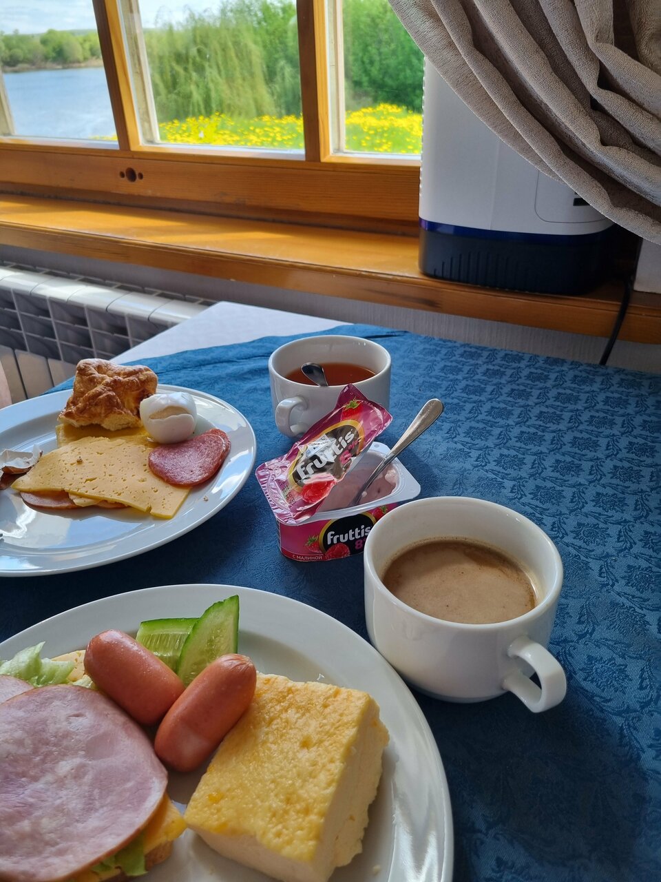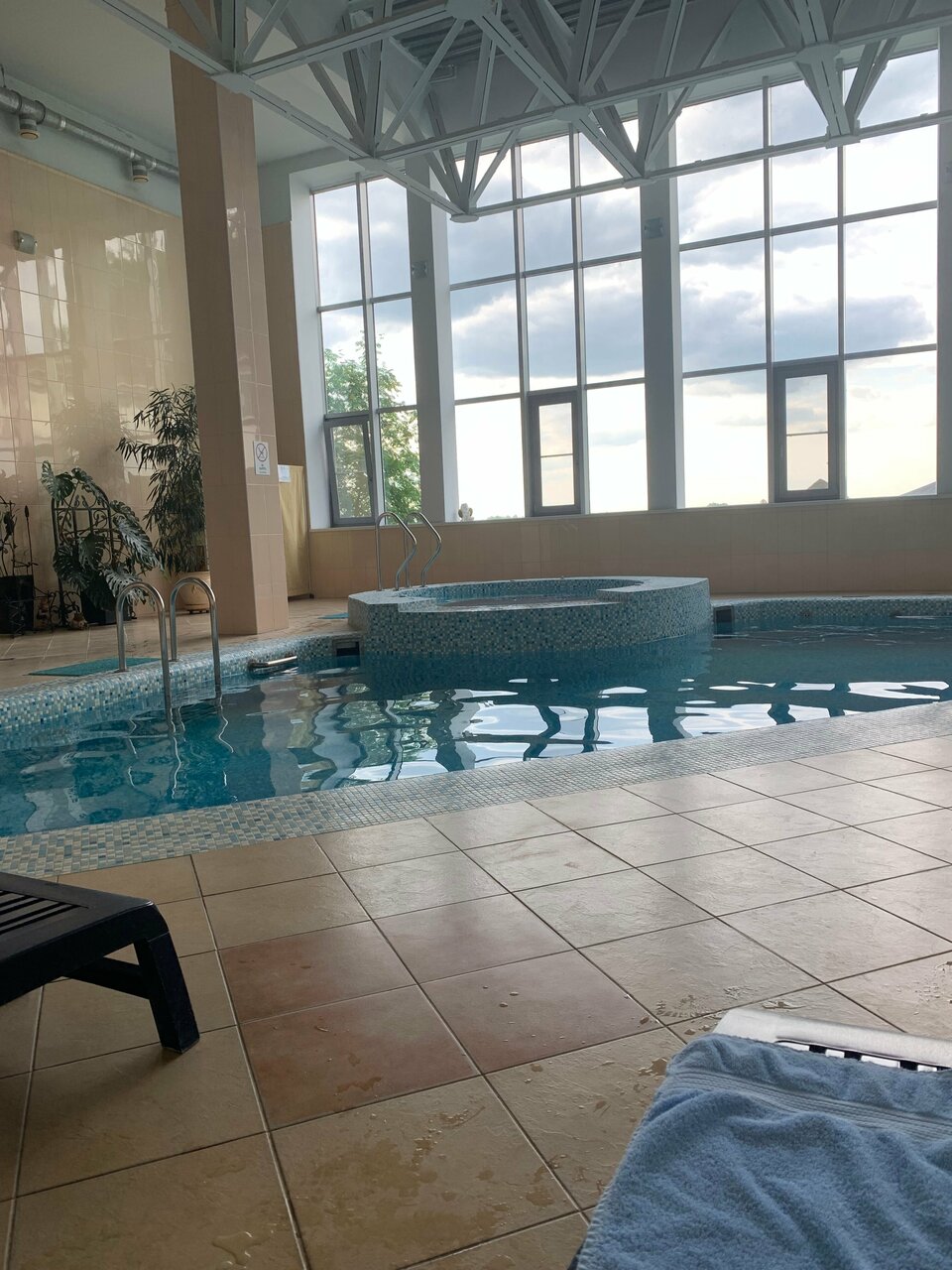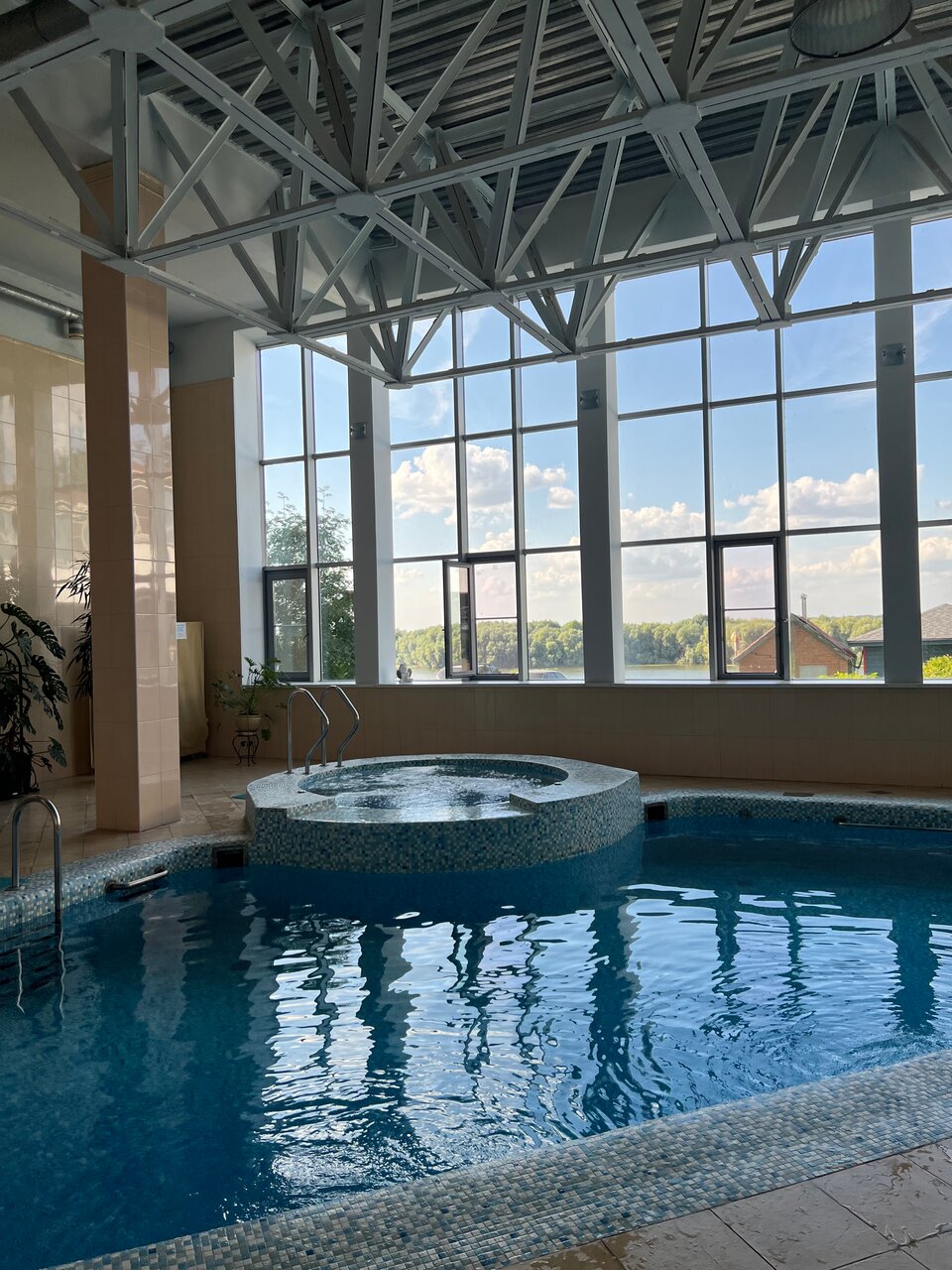 Шикарный отель, в 6 км от центра города. Закрытая территория, есть парковка для машин, много беседочек и прекрасные качели. На территории есть ресторан выше всяких похвал. Очень вкусная еда и обходительные официанты. Из ресторана вид на реку, ну что ещё нужно, чтобы запомнить это надолго. На территории есть бассейн 10 метров, выдаются полотенца и ключик от кабинки. В идеале 1-3 человека, но это уж как повезёт. С номером повезло, т.к. бронировали с видом на речку. Есть халат, тапочки. В номере телевизор, холодильник, халаты, тапочки, есть сейф. В душевой были крючки, чтобы повесить халат их обычно никогда не бывает, а тут такое счастье. Уезжать не хотелось.