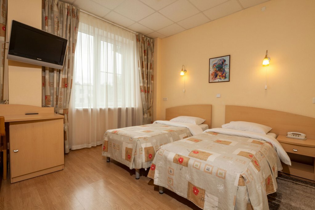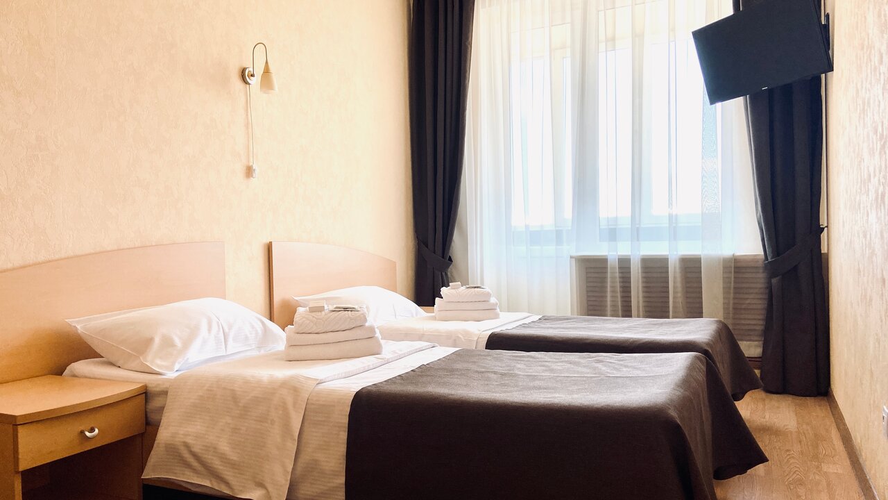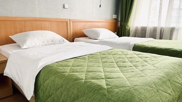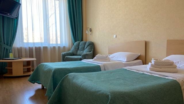 Просторный двухкомнатный номер (38 кв.м) квартирного типа состоит из прихожей, двух спален и большой ванной комнаты с душевой кабиной. В большинстве номеров — балкон