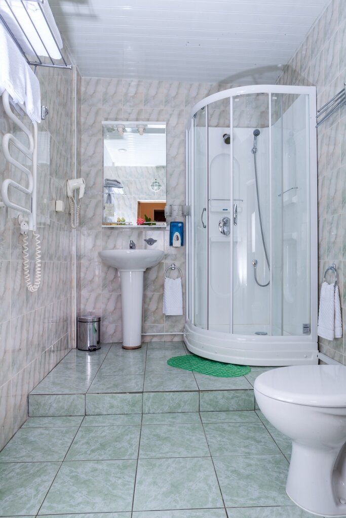Просторный номер площадью 25 кв. м. с большой 2-х спальной кроватью и ванной комнатой с душевой кабиной