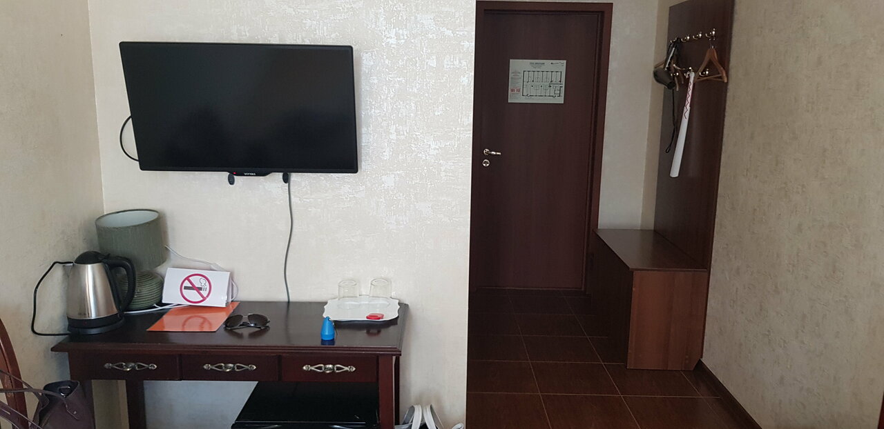 Однокомнатный двухместный номер. В номере одна двуспальная кровать и диван кровать, телевизор, бесплатный wi-fi, тумбочка, стул, стол, холодильник, вешалка для верхней одежды.