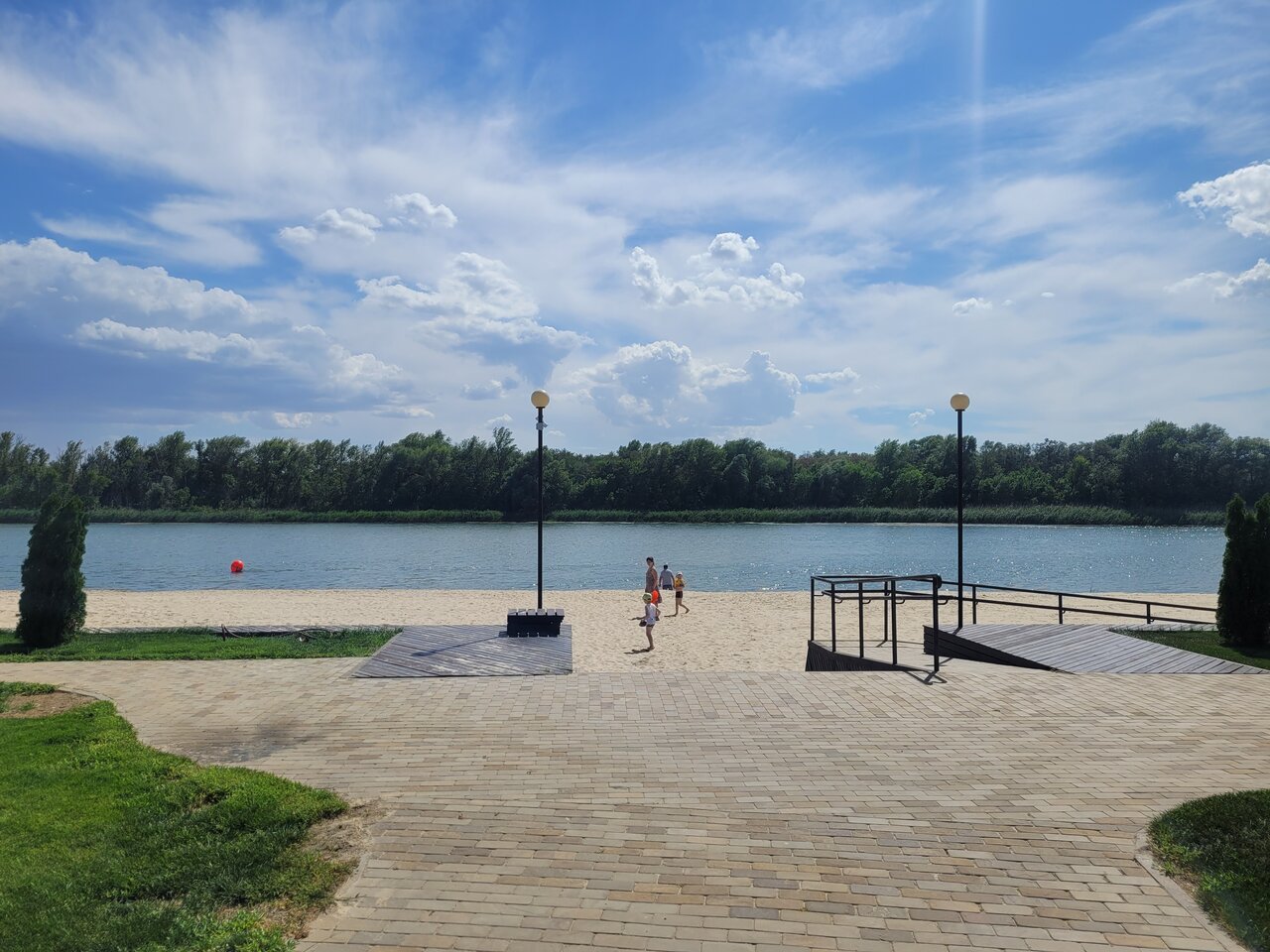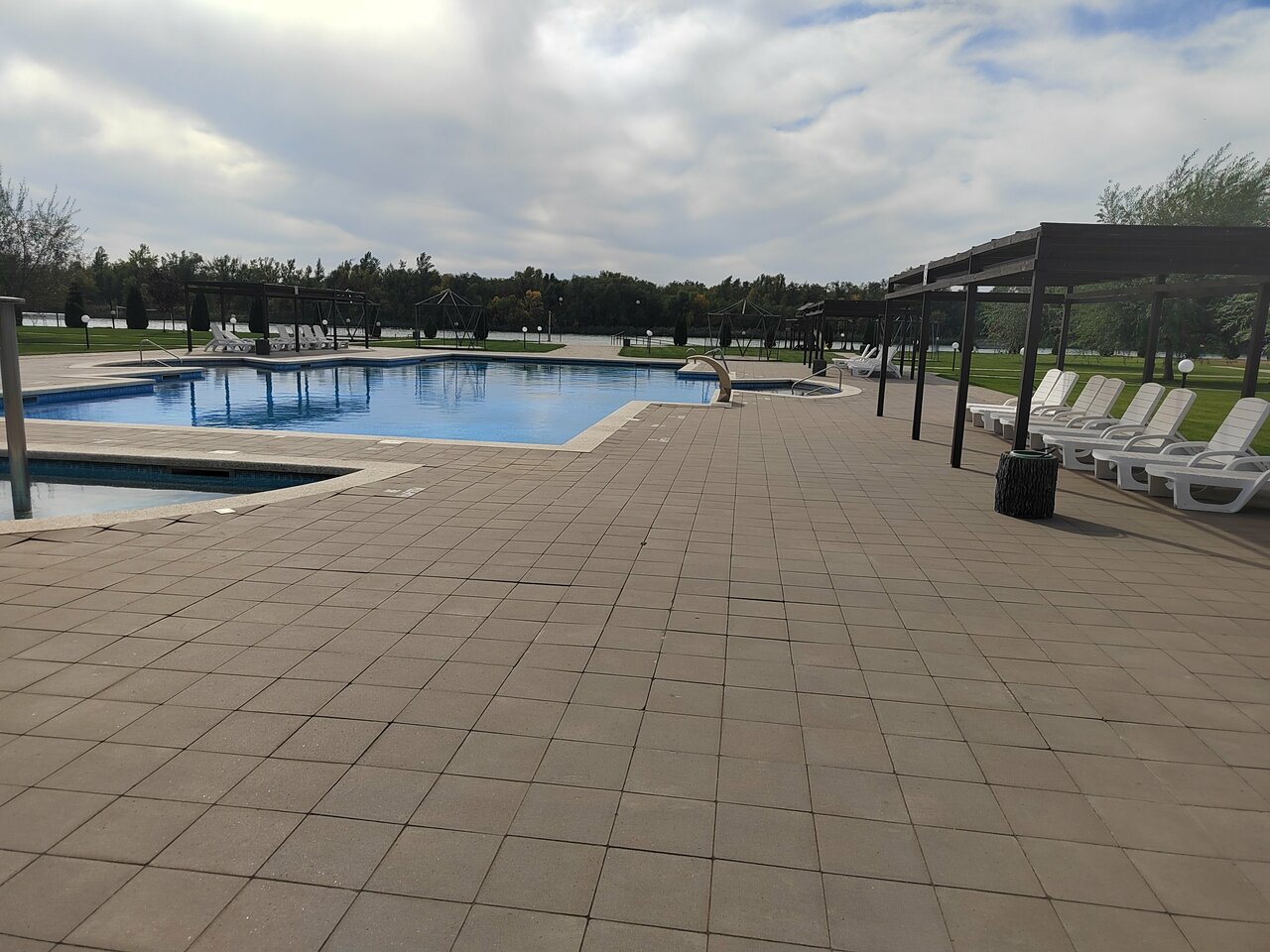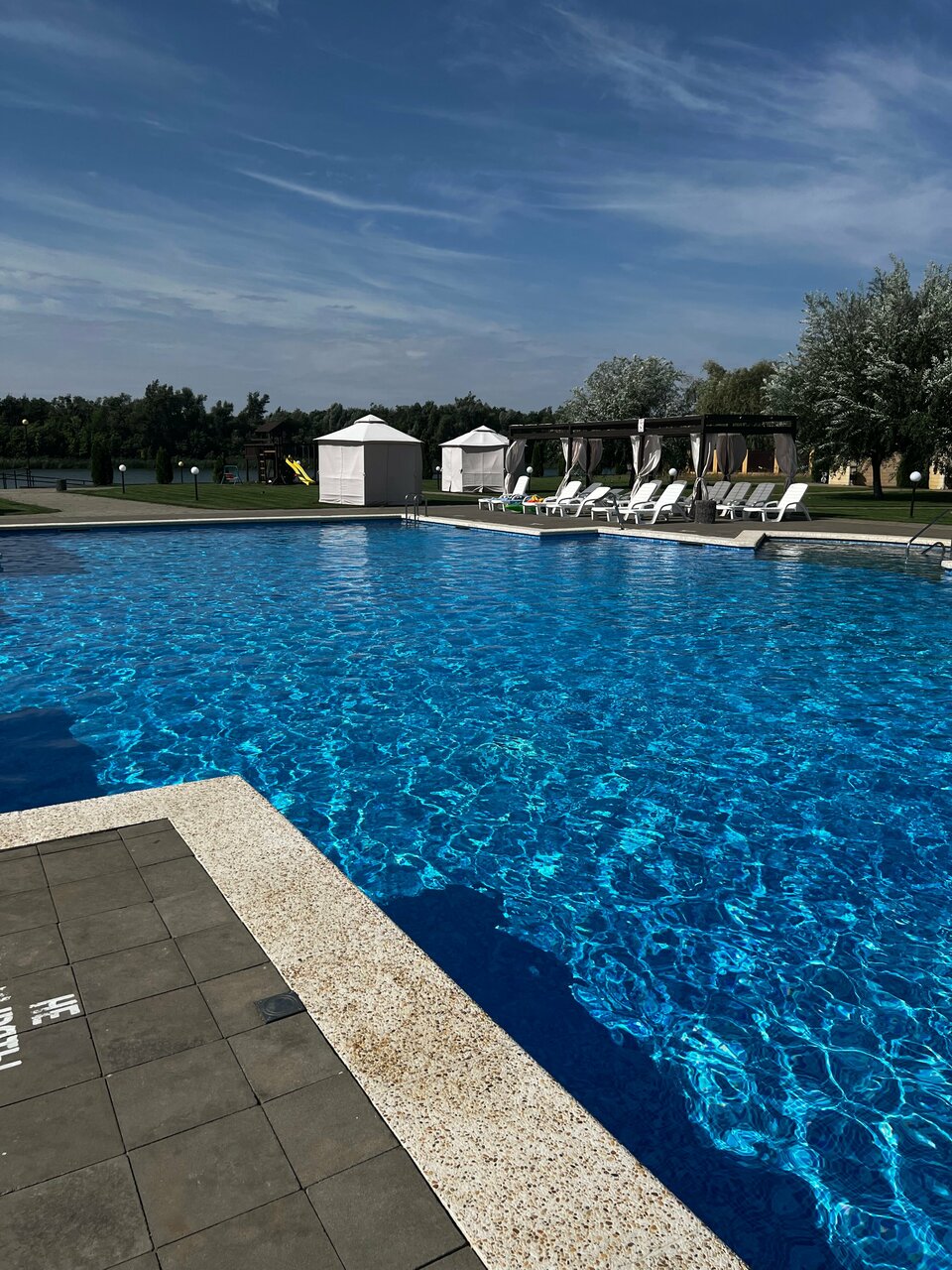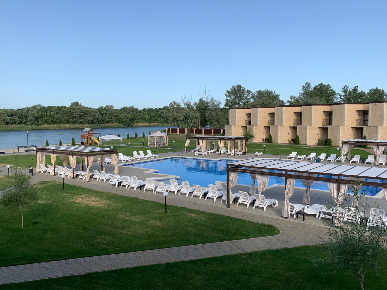 Ухоженая территория, бассейн чистай, глубина разная. Есть детская площадка, пляж чистый.