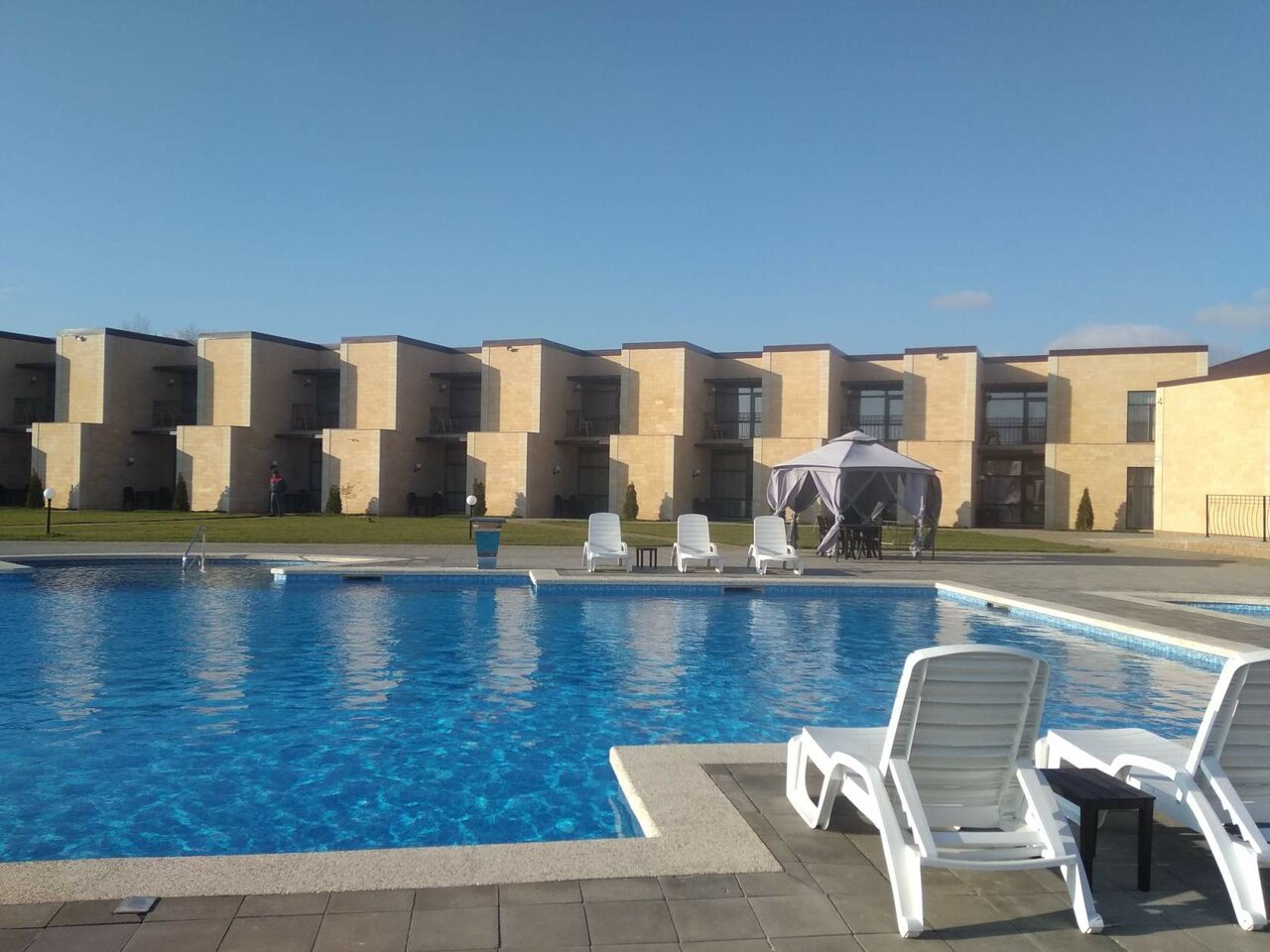 Отличное место, ухоженная территория, чистые номера с новым ремонтом. В номерах все необходимое: холодильник, шкаф, сушилка для белья. Выход со всех номеров к большому бассейну, есть маленький, видимо, для детей. Пляж с белоснежным песком, очень чистый. Персонал вежливый. Рекомендую к посещению и отдыху.