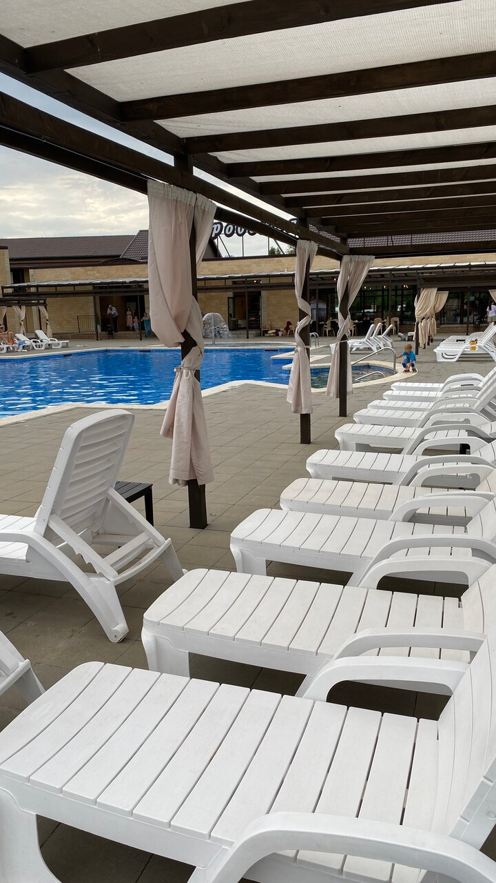 Из плюсов: красивая территория, неплохия номера, хороший бассейн. Минусы: слишком дорого для такого уровня сервиса: завтраки, включённые в стоимость, одно название, есть практически нечего, холодильника в номере нет, на данный момент отключены и вода, и свет. Имейте в виду: расположение на берегу Дона, поэтому вечер и ночь-огромное количество мошкары, окна и балкон не откроешь