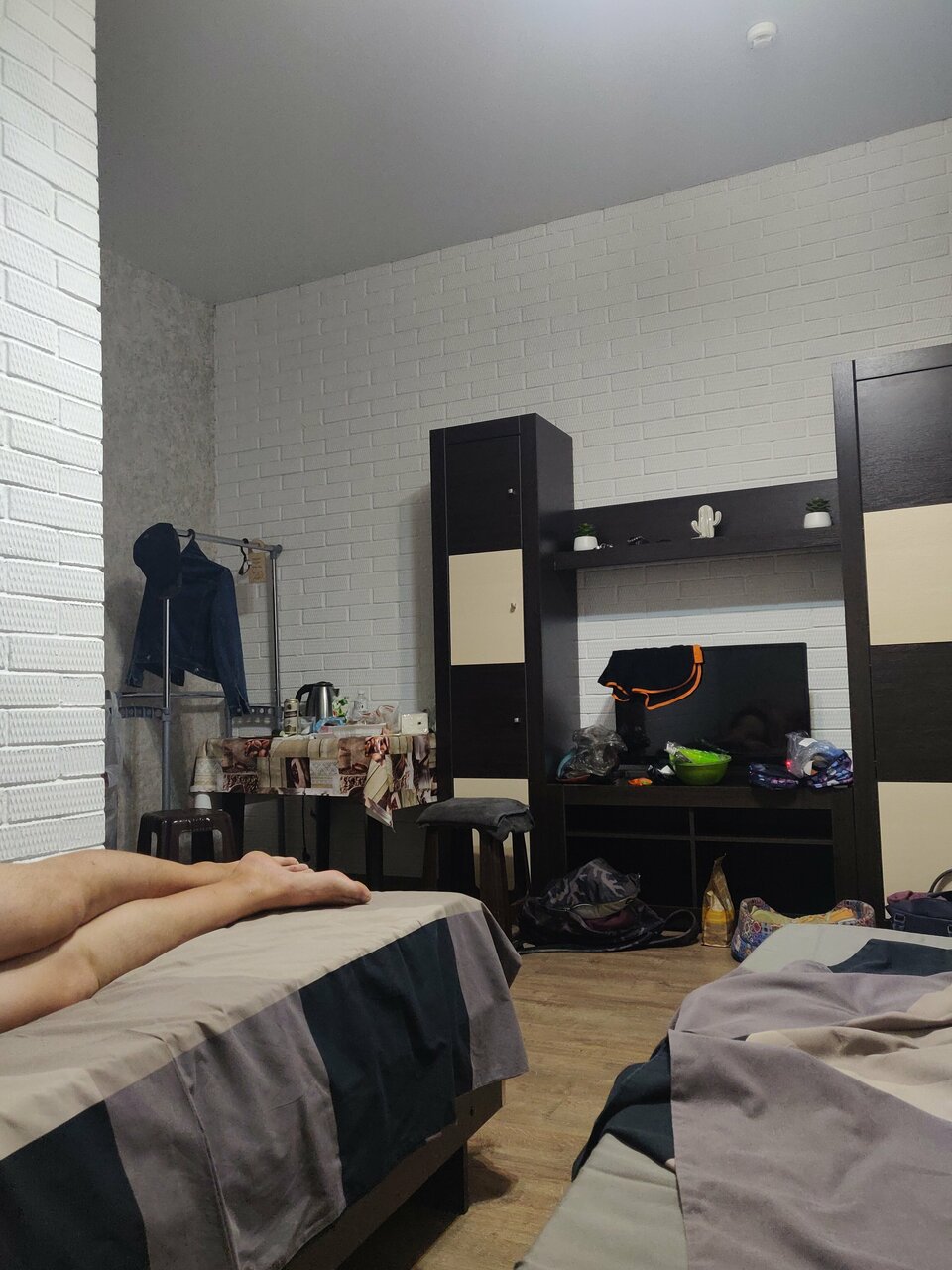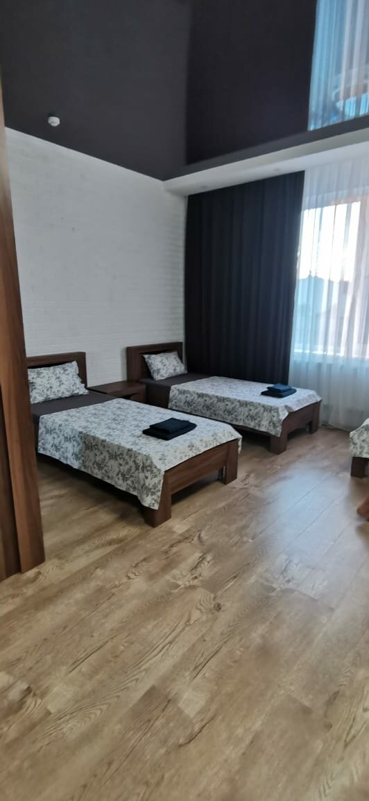 Для короткого отдыха советую. Стоимость студии 2000р (хотя на сайте 1800р). Ехали транзитом, администратор принял нас поздно. Сразу заселили. Гостевой дом очень понравился. Расположен на втором этаже здания, а на первом есть мойка авто. Рассчитаться можно переводом. В номере номер 5 (студия) совмещённый санузел: душевая кабина из кафеля, унитаз, умывальник, бойлер. В мини-прихожей стол, чайник, чашки, сахар, пакетики зелёного и чёрного чаёв, плечики и стойка для одежды. На кроватях нормальные матрацы. Самое главное после знойного дня — кондиционер. Он есть. Баз него нормального отдыха не будет. Остальное смотрите на фото