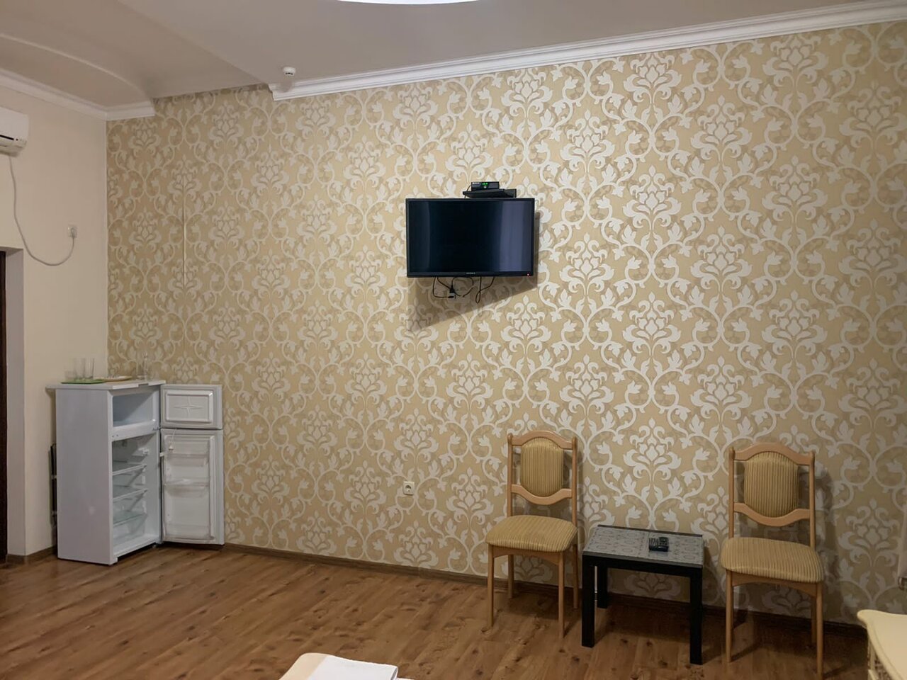 3-х местный номер с одной двуспальной кроватью и одной односпальной санузлом, ТВ, холодильником, кондиционером, Wi-Fi и окном с видом на двор. Бронирование от 2-х суток.