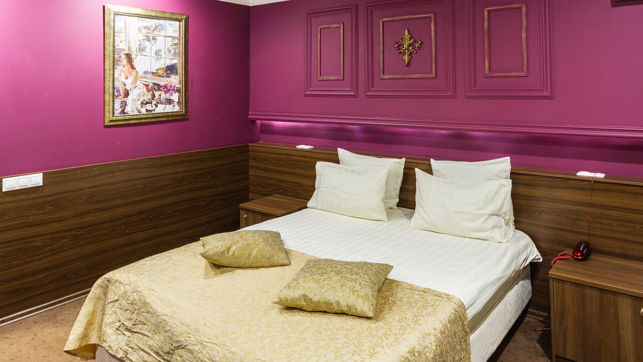 Комфортный номер с двуспальной кроватью и прикроватными тумбочками, общей площадью 24 м. кв.В номере:махровые тапочки, набор личной гигиены, душ, фен, LCD телевизор / 3D SMART TV, кондиционер, сейф, телефоны внутренней связи, шкаф-купе, два кре