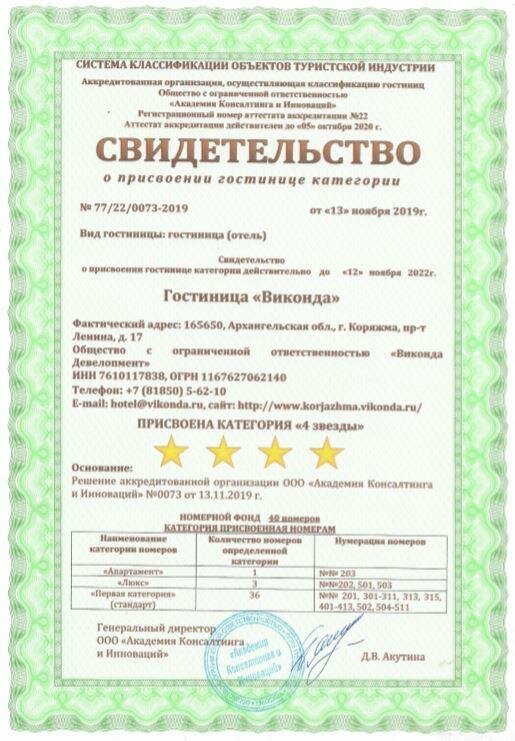 Гостиница «Виконда» (Коряжма, проспект Ленина, 17) — четырёхзвёздочный отель с круглосуточным обслуживанием. Номера оснащены кондиционером, санузлом, холодильником, мини-баром, телевизором и бесплатным Wi-Fi. Гости могут воспользоваться парковкой, лифтом, прачечной, кафе, рестораном и салоном красоты. Доступны завтрак, ужин или питание по выбору. Отель расположен в центре города, рядом с парком. Заезд — с 13:00, выезд — до 12:00.
