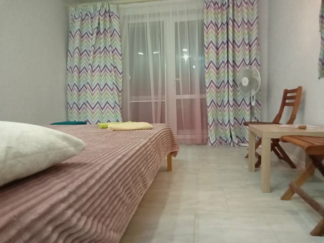 Комната площадью 18 м2 с мини-кухней, двуспальной кроватью и шкафом, санузлом с душевой, феном, туалетными принадлежностями и полотенцами, есть Smart TV, WiFi. Мини-кухня оборудована индукционной плитой, микроволновкой, есть необходимая посуда