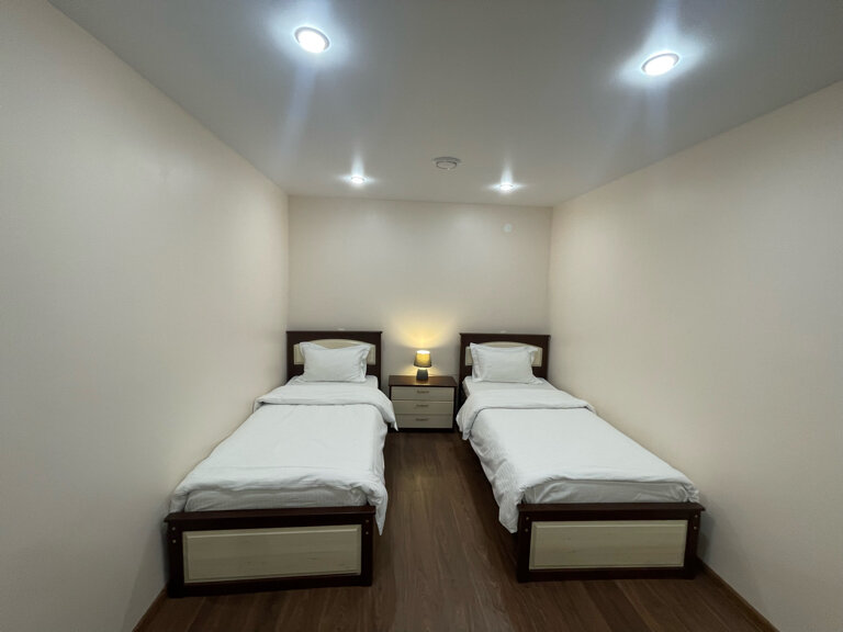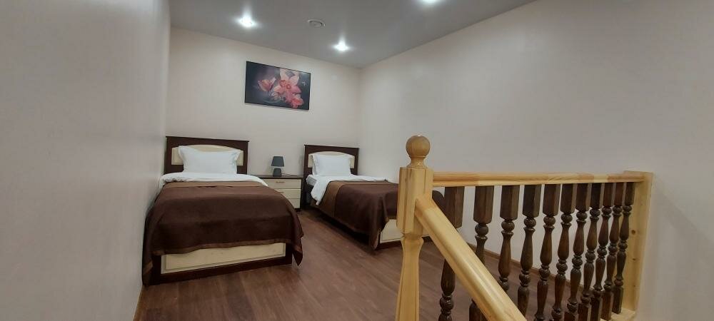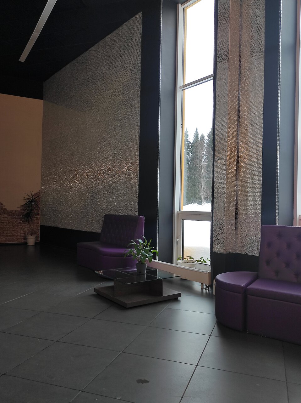 Отель стоит в отдалении от жилых домов, близко к парку и смотровой площадке Костомукши. Все номера двухуровневые: есть стандарт с окном или без, также номер люкс, в котором я и жила. В номере на втором этаже огромная двуспальная кровать, хоть поперёк спи)) На первом этаже тв, трёхместный диван, столик. Есть окно в пол, которое открывается, и можно из номера выйти сразу на улицу. В ванной большая душевая зона, два халата, принадлежности для мытья. При отеле есть ресторан, в котором представлена узбекская кухня. Мне понравилась долма, шурпа и самса из тандыра. В целом всё хорошо. Одну звезду снизила за то, что полы холодные, особенно в ванной тепла не хватает. Может, когда-то решат этот вопрос)) Плюс халаты белые есть для пары, а тапочки не предусмотрены.. А хочется полного комфорта!
