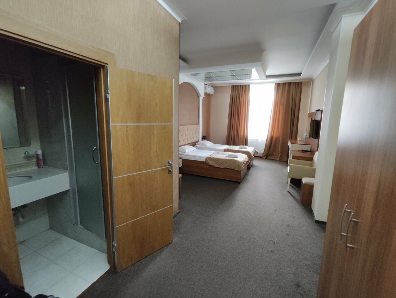 Бюджетная гостиница, в номерах чисто, прохладно, но это в данном случае скорее плюс, чем минус. Весьма скудный завтрак, особенно если долго проживаешь в гостинице. Минус один — душевая! В которой как не стараешься все равно вся ванная комната будет в воде(.