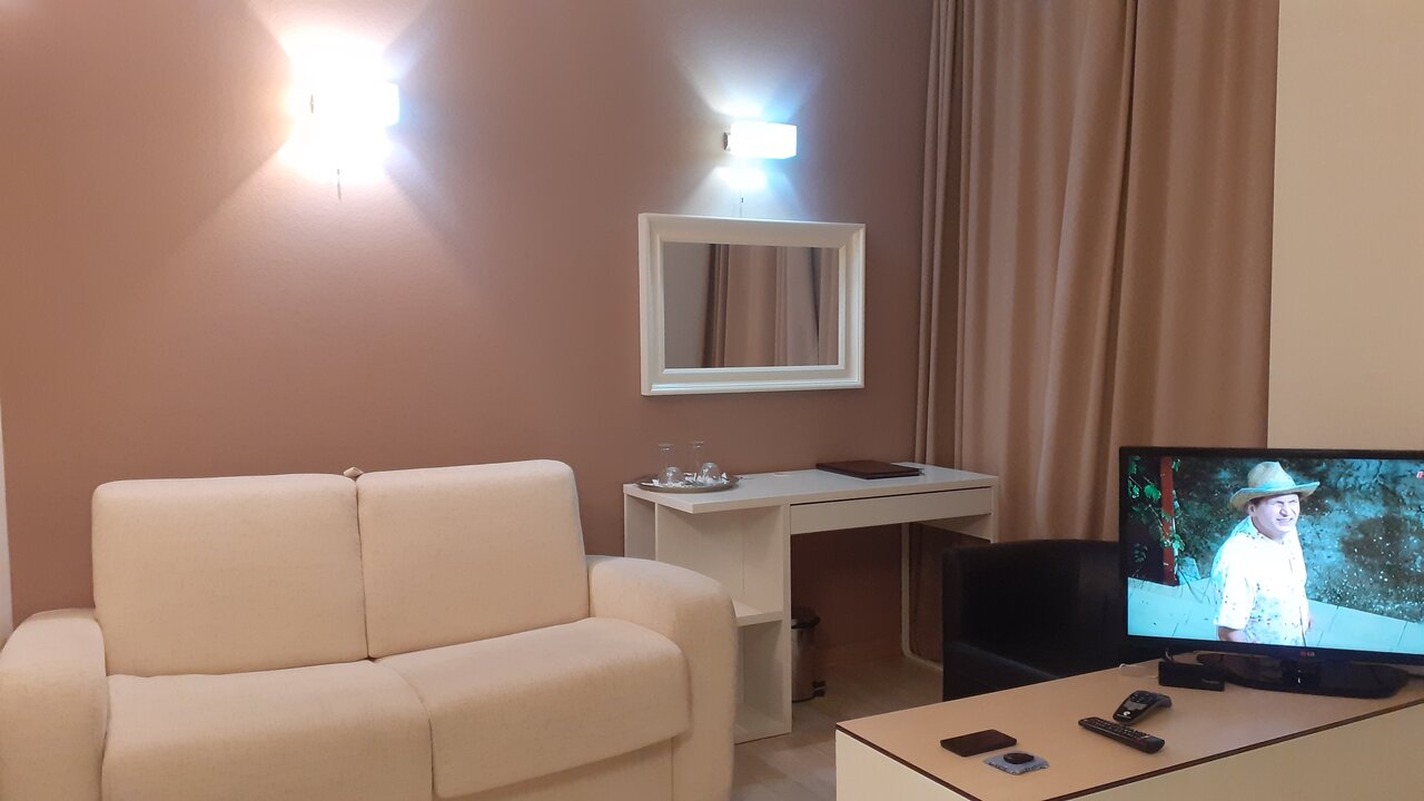 Отличное место, замечательно отдохнули с детьми перед морем, ехали 13 часов очень устали. Номер чистый, постельное белье кристально чистое, есть чайник, холодильник, фен, кондиционер, полотенца и халаты. Вежливый персонал, вкусная еда в ресторане гостиницы. Свежий современный ремонт. Мы в восторге, если останавливаться будем, то только там.