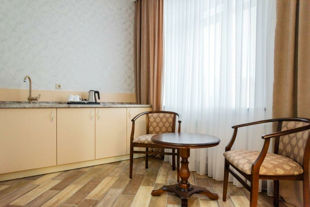 Расположена по адресу: ул. Конституции, 2А, 2 этаж. Мини-отель категории 3 звезды с круглосуточным обслуживанием предлагает комфортные номера, оснащённые кондиционером, Wi-Fi, мини-баром, телевизором и звукоизоляцией. В наличии кухонные уголки, чай/кофе, халаты и тапочки.