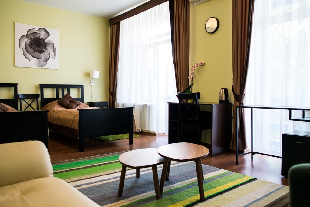 Удобный и уютный номер. Здесь Вы сможете найти всю необходимую технику и современную мебель. На дополнительном диване можно разместить третьего гостя. Стоимость услуги составляет 1000 рублей.В стоимость проживания включен завтрак на выбор.