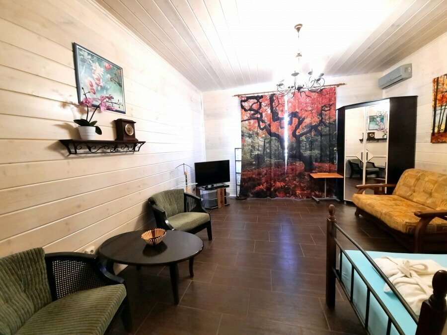 20 кв.м1 Большая Двухспальная кровать + Двухспальный диванМаксимум 3 гостяСобственный с/у с ваннойTV, кондиционер, холодильник, чайник,WIFIСтоимость - от 3000 руб/сутки
