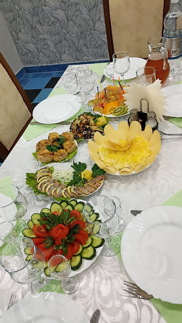 Праздновали юбилей родственника. Это был проходной зал, вход со стороны дороги. Место конечно не самое призентабельное. Старые плюшевые занавески. Бордовые стены. Им бы хорошего дизайна и опрятности. Зал очень душный, вентиляции нет. Кухня тоже на любителя.