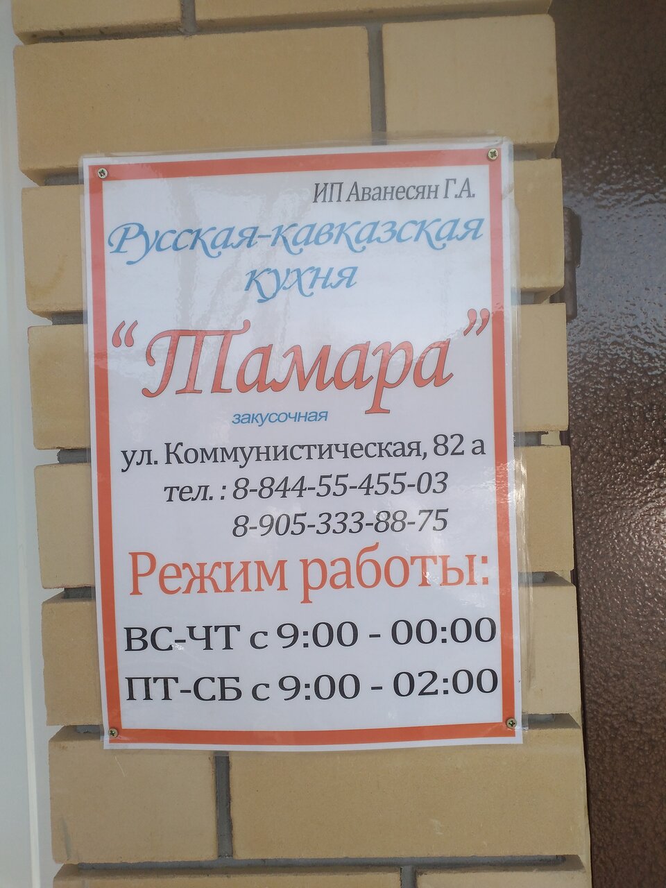 Была пару раз в ‘Тамаре’ на юбилее понравилось очень. Кухня просто класс, обслуживание тоже очень понравилось, музыка очень хорошая!!! Ещё была пару раз с друзьями остались все довольны!!! Подумываю свой юбилей отметить тоже в ‘Тамаре ‘)))Процветания и успеха всем кто работает в кафе!!!!