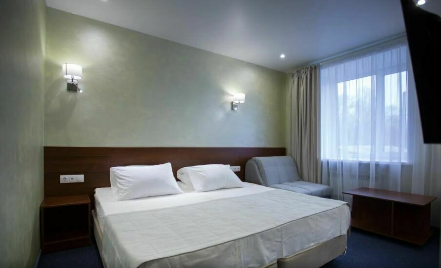 В номере две кровати по 80 см., сан.узел, телевизор, холодильник, сплит-система, стол, кресло, диван