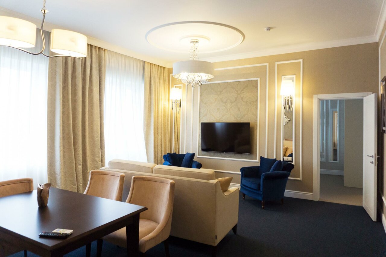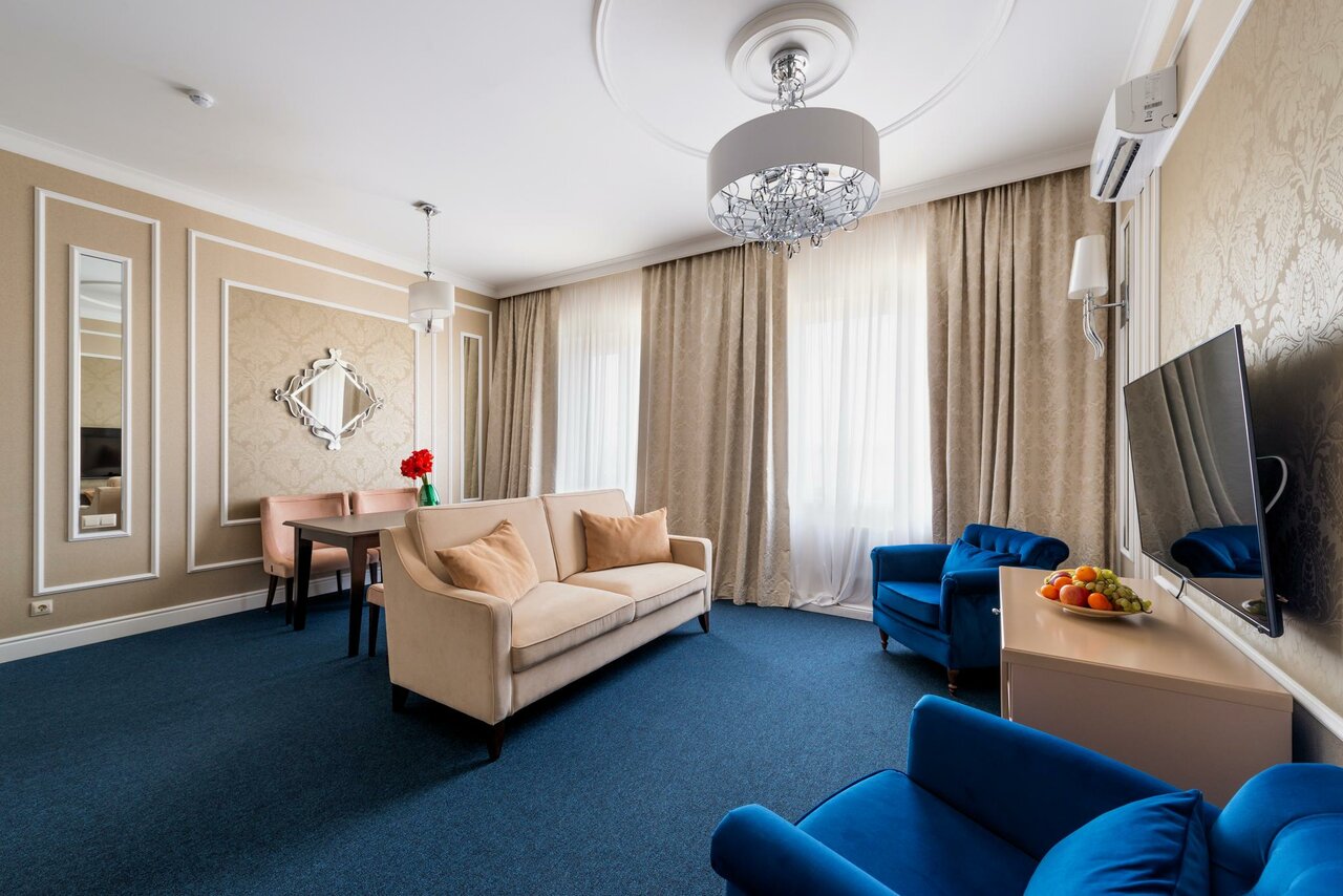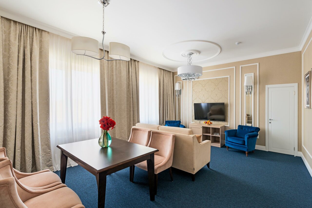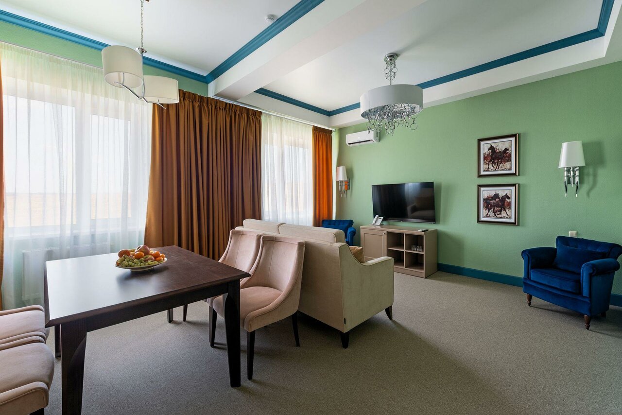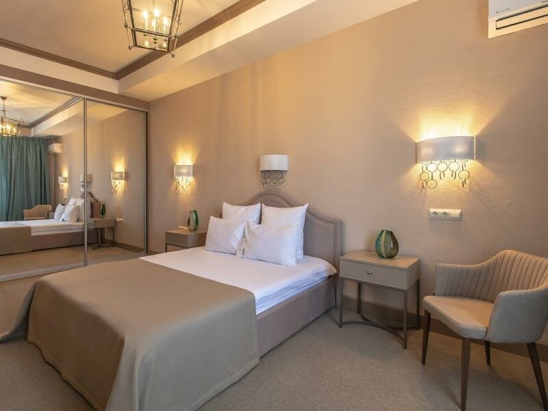Гостям доступны номера с кондиционером, Wi-Fi, телевизором, мини-баром и феном. На территории отеля — два бассейна (включая открытый и подогреваемый), сауна, баня, оздоровительный центр, spa, ресторан, два бара, кафе и летняя веранда. Для активного отдыха предусмотрены ледовый каток, катание на лошадях, пляжный волейбол, детский клуб и игровая комната.
