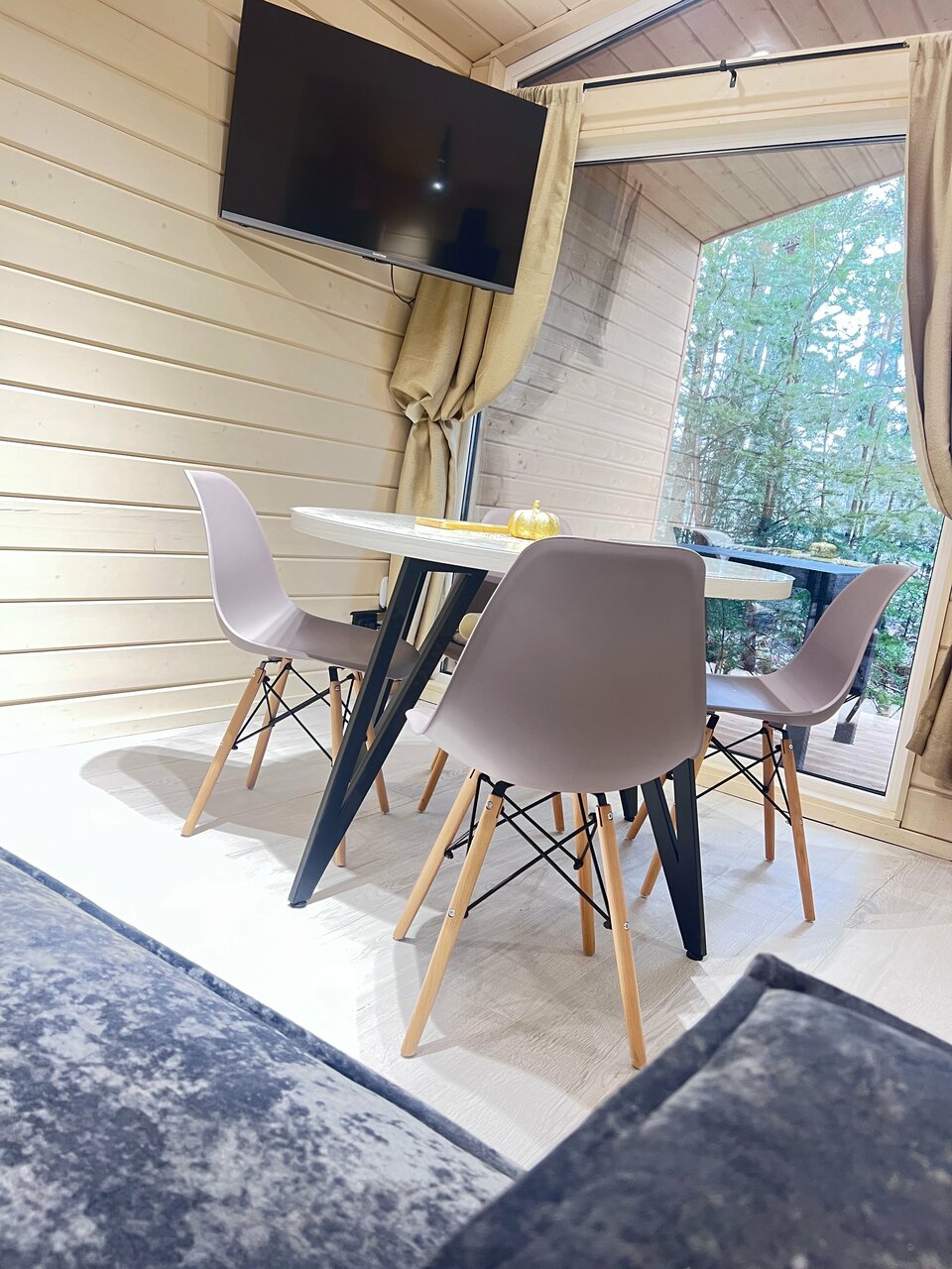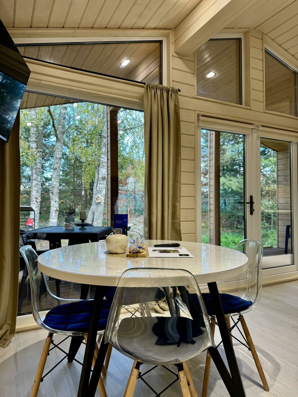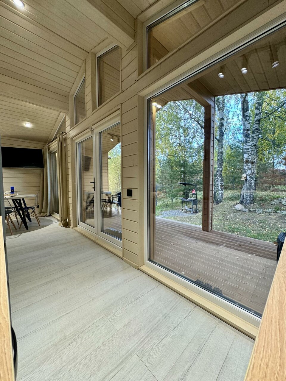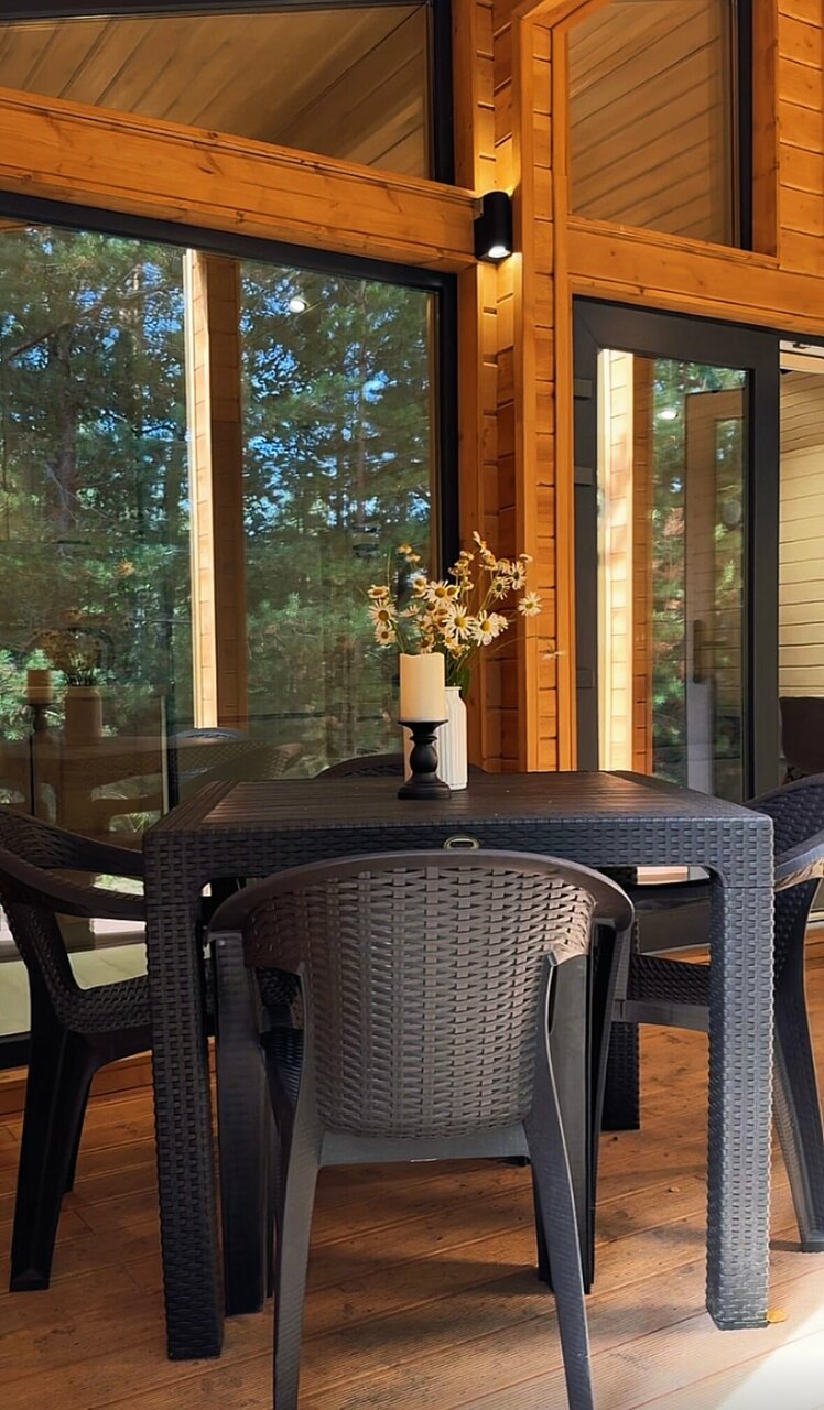 Все очень понравилось ! Чистенько, аккуратно, со вкусом ! Панорамные окна в пол с выходом на террасу, где стоит столик и можно кушать на улице с видом на лес , рядом стоит мангал ! Можно прогуляться по лесной тропинке !