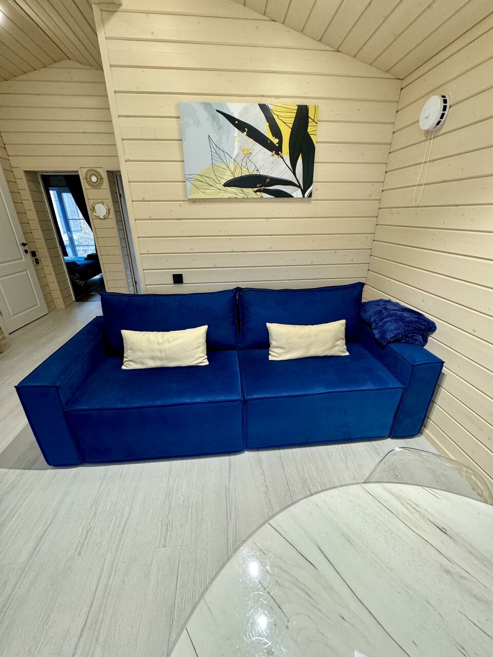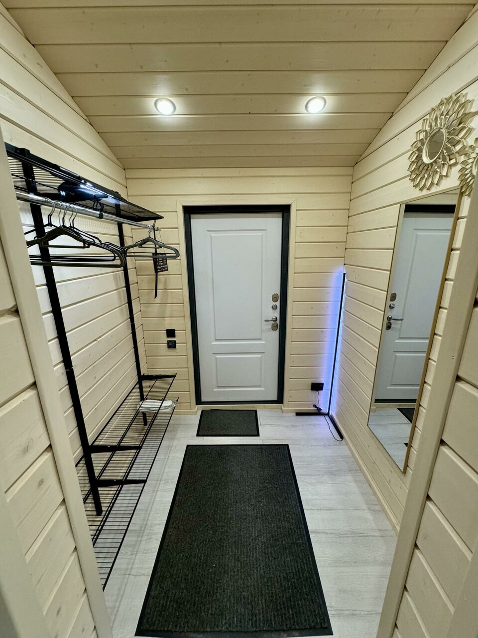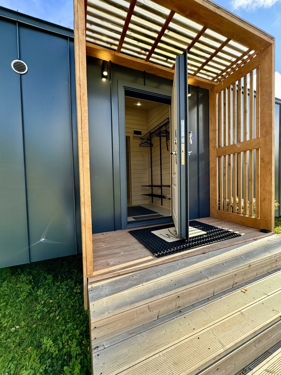 Очень уютный и комфортный домик для краткосрочного (или долгосрочного) пребывания. Стильный дизайн, красивые панорамные окна и много естественного света. Есть все необходимое (мебель, техника, кухонные, ванные принадлежности и тп). На территории рядом расположен еще один аналогичный домик, что может быть удобным, в случае отдыха 2-мя семьями/ компаниями, расположившись рядом. Хотелось бы в идеале видеть больше леса, природы — для прогулок на территории и вне.