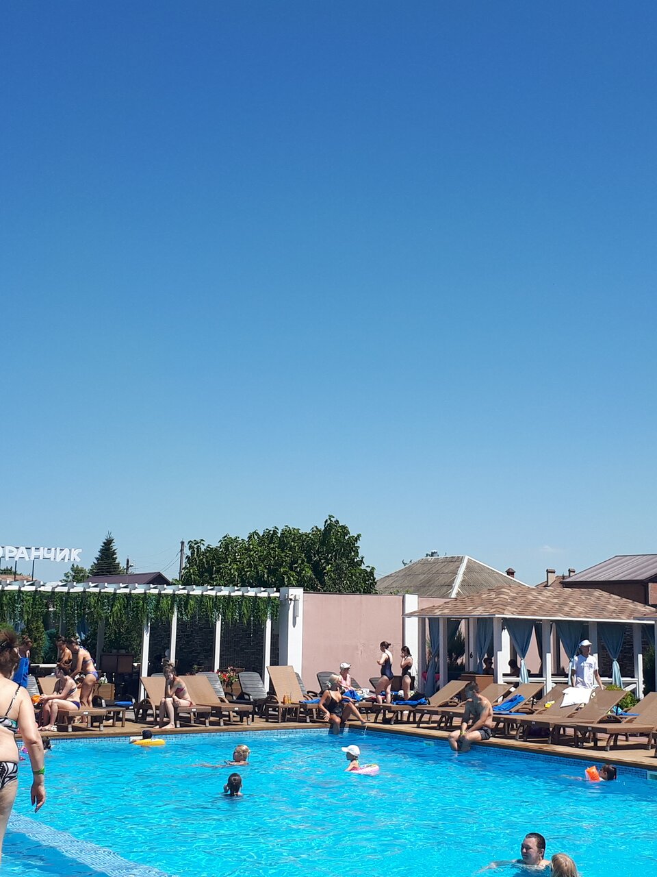 Очень вкусная еда.И бассейны чистые .Территория в общем хорошая,но вот в дальнем бассейне один минус :очень скользкая плитка .Ребёнок не мог ходить по ней .И во втором на лестнице вздулась лестница.Чисто по этому не поставила 5