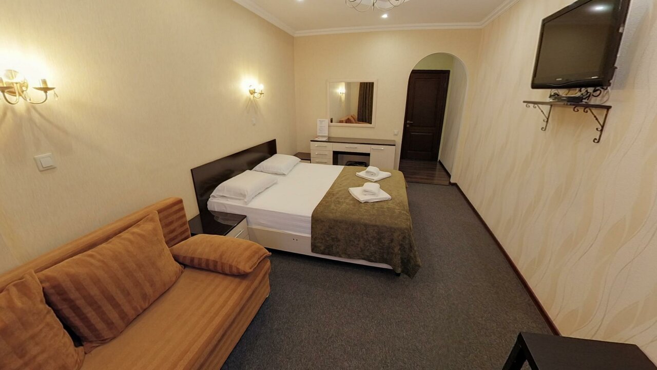 Двухместный номер стандарт в Краснодаре площадью 20 кв.м с видом на город.Подходит для размещения 2 человек. Имеет спальню с приятным интерьером.В номере: 1 двуспальная кровать.Имеется телевизор, кондиционер, отопление, шкаф, вешалка, зеркало...