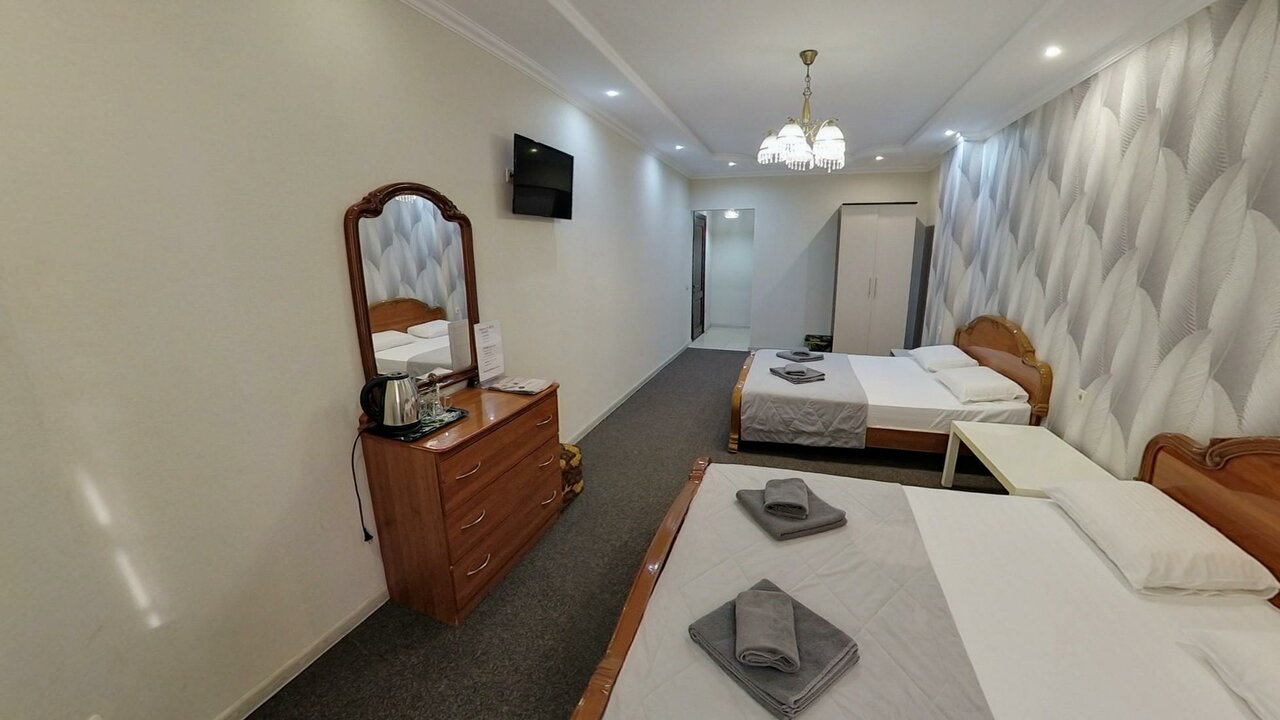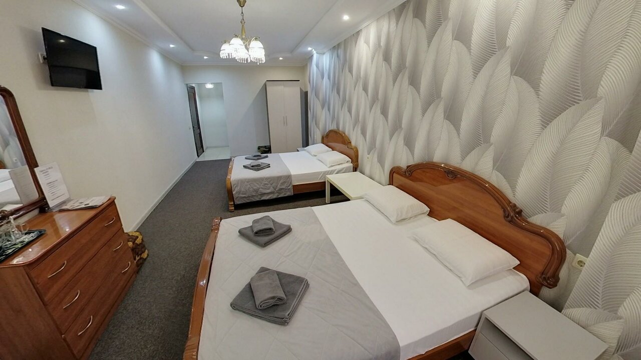 Семейный номер площадью 30 кв.м с видом на город.Подходит для размещения 4 человек. Имеет спальню с приятным интерьером.В номере: 2 двуспальные кровати.Имеется телевизор, кондиционер, отопление, шкаф, вешалка, зеркало, комод, прикроватные тумб...